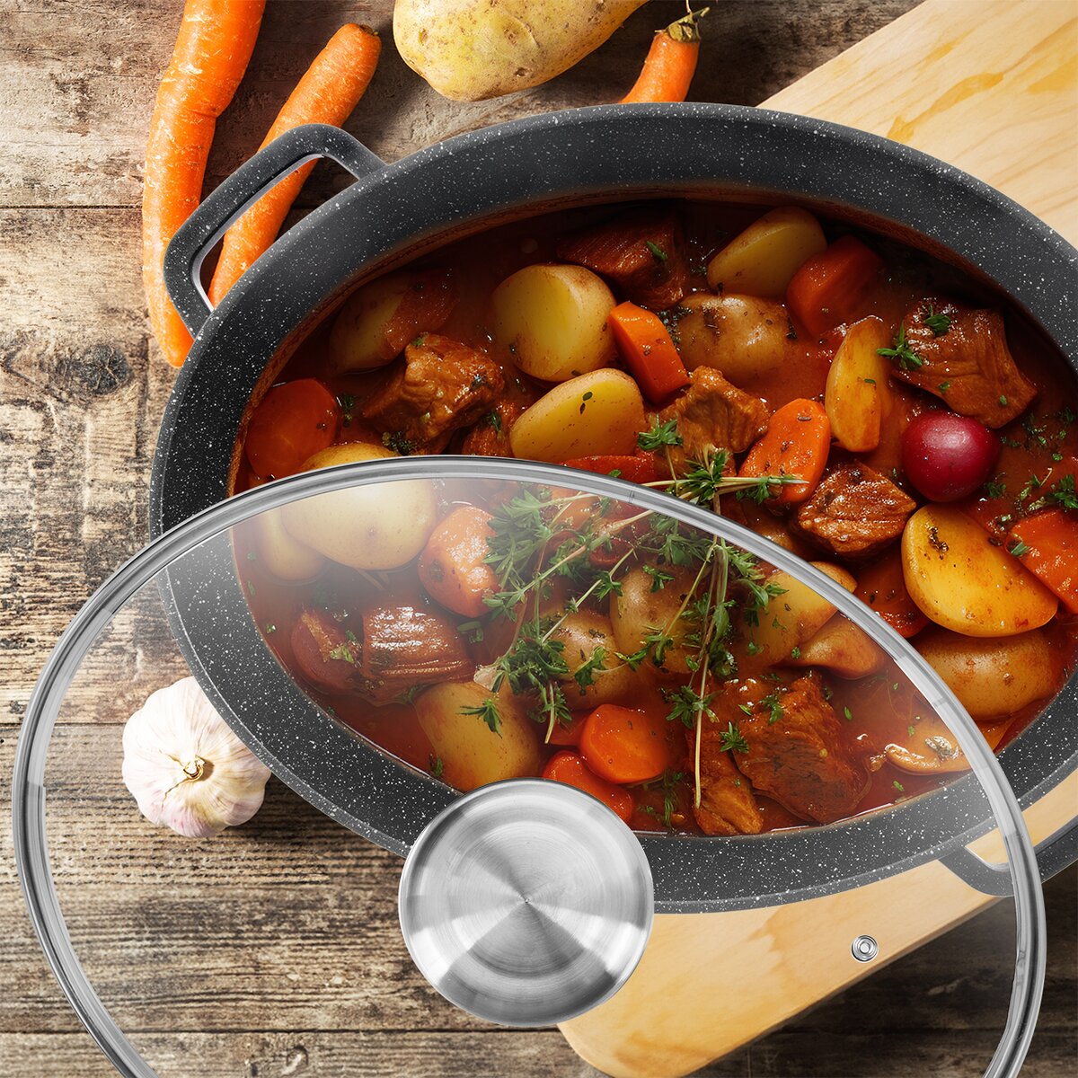 - sklenená pokrievka je opatrená arómou úchytom, do ktorého môžete nalievať víno, aromatizované oleje a dochutiť pokrm bez nutnosti odklopenia pokrievky