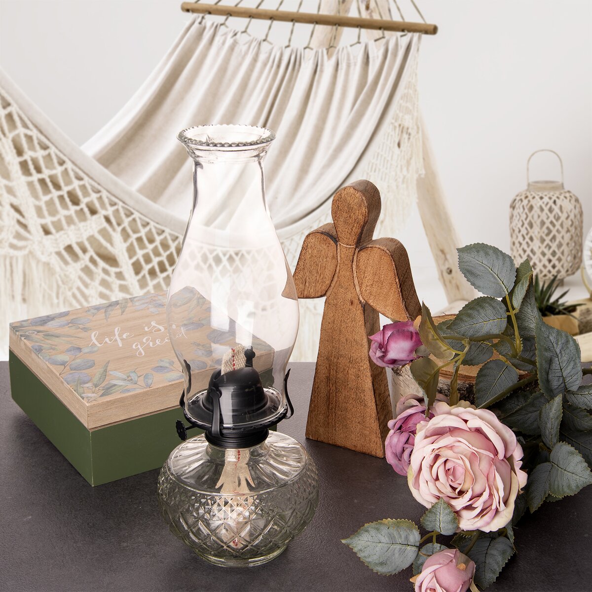 Kód produktu 822259Petrolejová lampa so skleneným telom, klasickým cylindrom s dekoratívnou hornou časťou a bavlneným knôtom slúži po naplnení petrolejom alebo lampovým olejom ako doplnkové svetlo v interiéri.