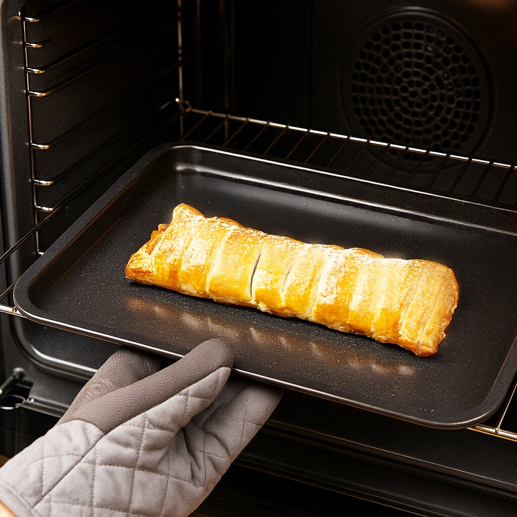 Vnútorný rozmer plechu je 36,5x29 cm, hrúbka plechu je 0,6 mm. A pokiaľ dôjde k pripečeniu, napr. keď vytečie náplň z jablčnej štrúdle, stačí ho nechať odmočiť, a potom vložiť do umývačky alebo umyť ručne.