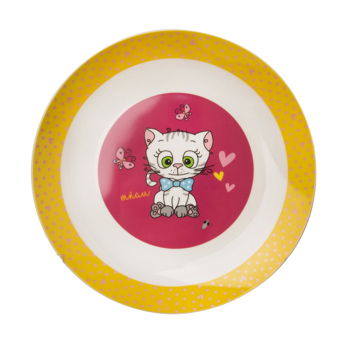 Kód produktu 128471Porcelánový plytký tanier s motívom mačičky s mašľou, s priemerom 21 cm, vhodný na servírovanie hlavného jedla i desiaty.