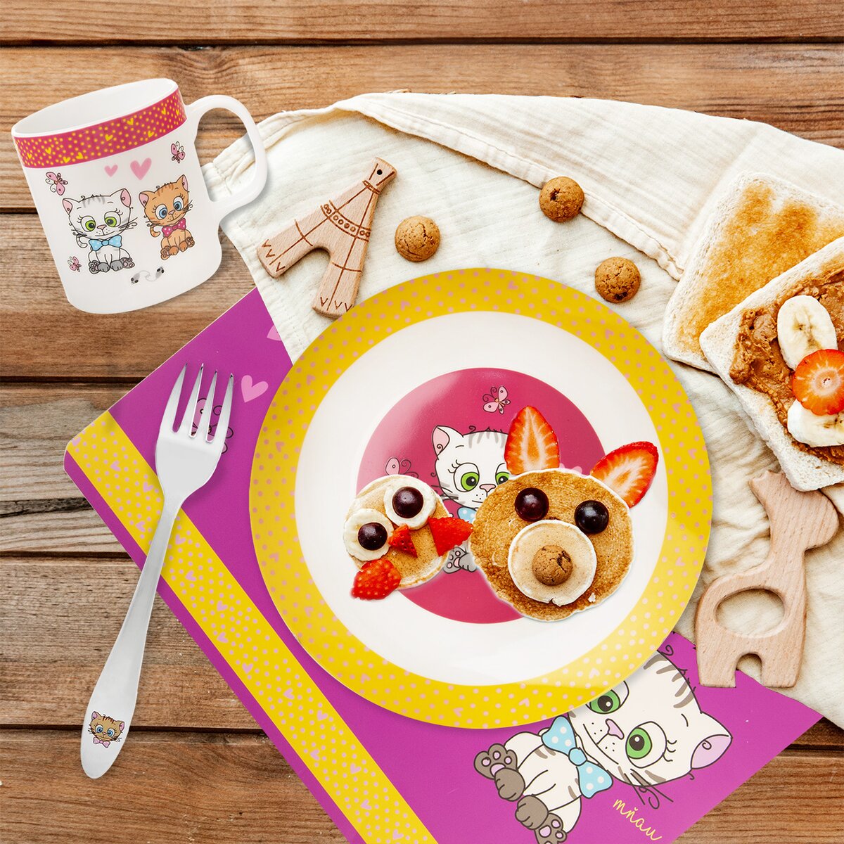 Plytký tanierik pre malých jedákov, ktorý ich poteší motívom mňaukajúce mačičky. Deti si tak vychutnajú hlavný chod, ako aj desiatu, toast, ovocie či zeleninu. A ak nechcú baštiť, motivujte ich tým, že až dojedia, uvidia roztomilú mačičku.