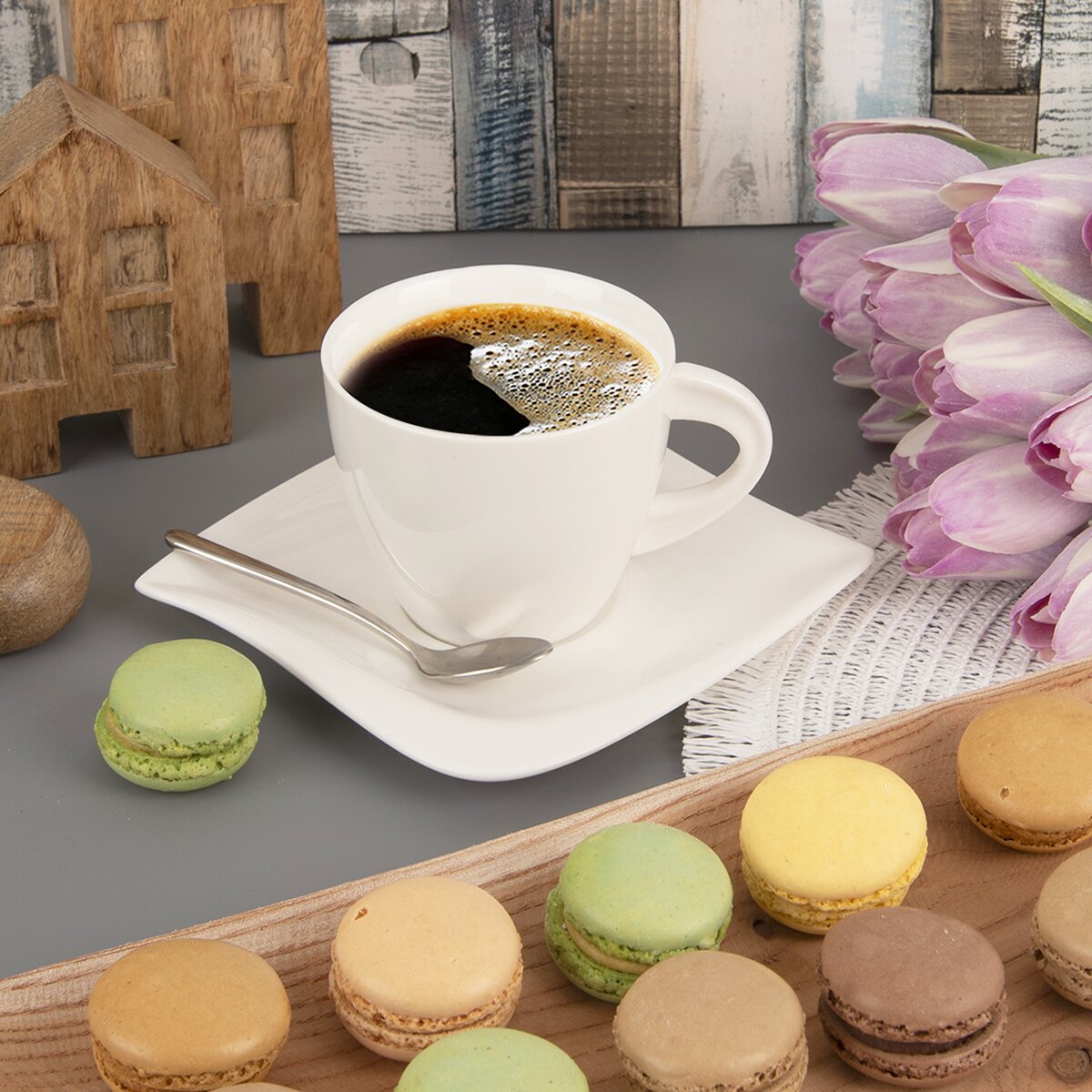 Viac informáciíZaujímavá hranatá podšálka je určená pod menšie hrnčeky so spodným priemerom cca 4,3 cm. Vyznačuje sa jednoduchou eleganciou. A pokiaľ príde návšteva na kávičku a zákusok, môžete ju použiť aj ako malý dezertný tanierik. Či už na venček, domáci rez alebo na klasický obložený chlebíček.