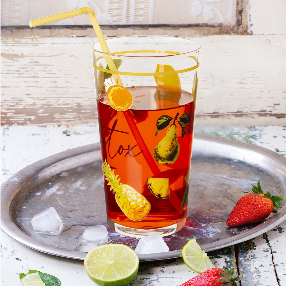 Kód produktu 129317Pohár s objemom 0,6 l s farebným dekorom citrónov, hrušiek a ananásu, vhodný nielen na letné nápoje a minerálky.