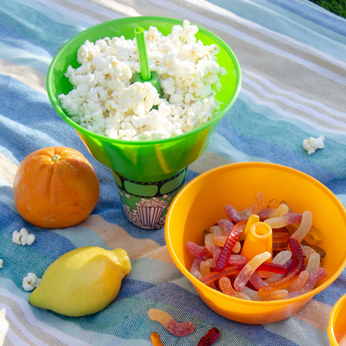 Do pohára stačí naliať nápoj, napr. colu alebo džús, uzavrieť miskou a do hornej misky nasypať popcorn, chipsy, oriešky alebo krekry. Do otvoru uprostred sa vsunie slamka a potom už môže premietanie začať. Budete si pripadať ako v kine.