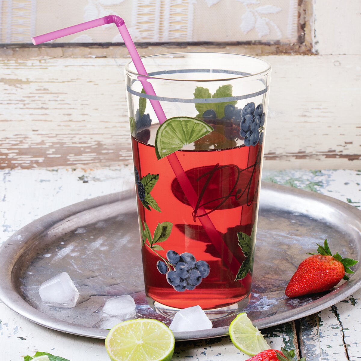 Vysoký pohár s krásnym farebným dekorom plným čučoriedok a citrusov sa hodí nielen na osviežujúce letné drinky alebo smoothie. Nestratí sa ani pri raňajkách alebo pri podvečernom posedení na terase alebo s priateľmi na záhrade.