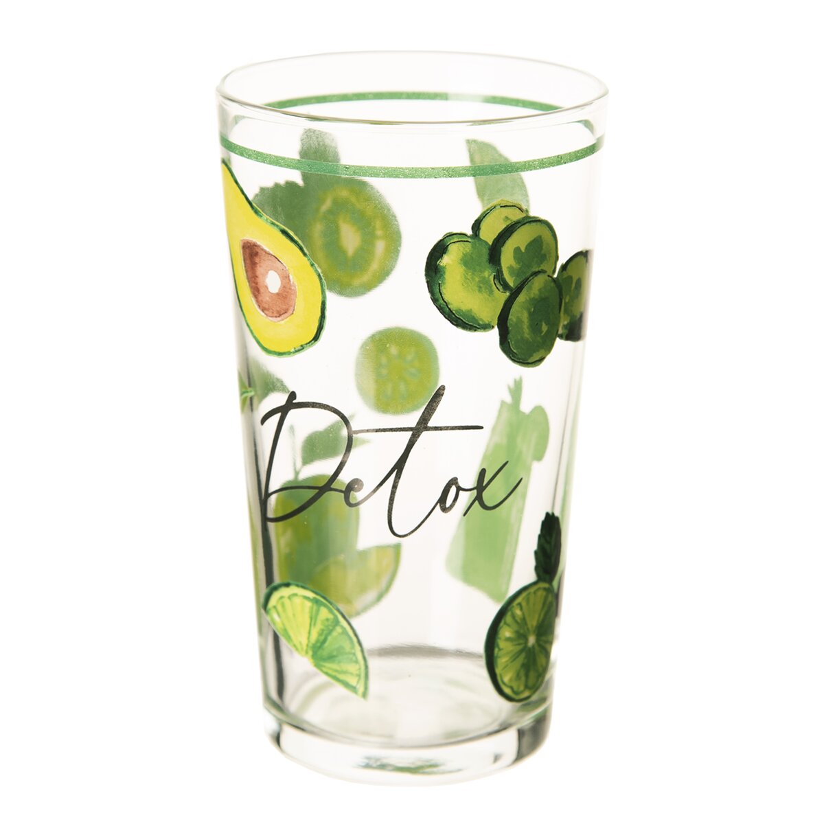 Kód produktu 129316Pohár s objemom 0,6 l s farebným dekórom zelených jabĺk, kivi, avokáda a uhoriek, vhodný nielen na letné nápoje a minerálky.