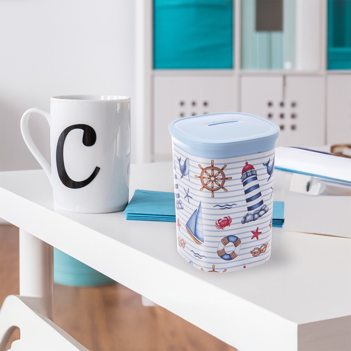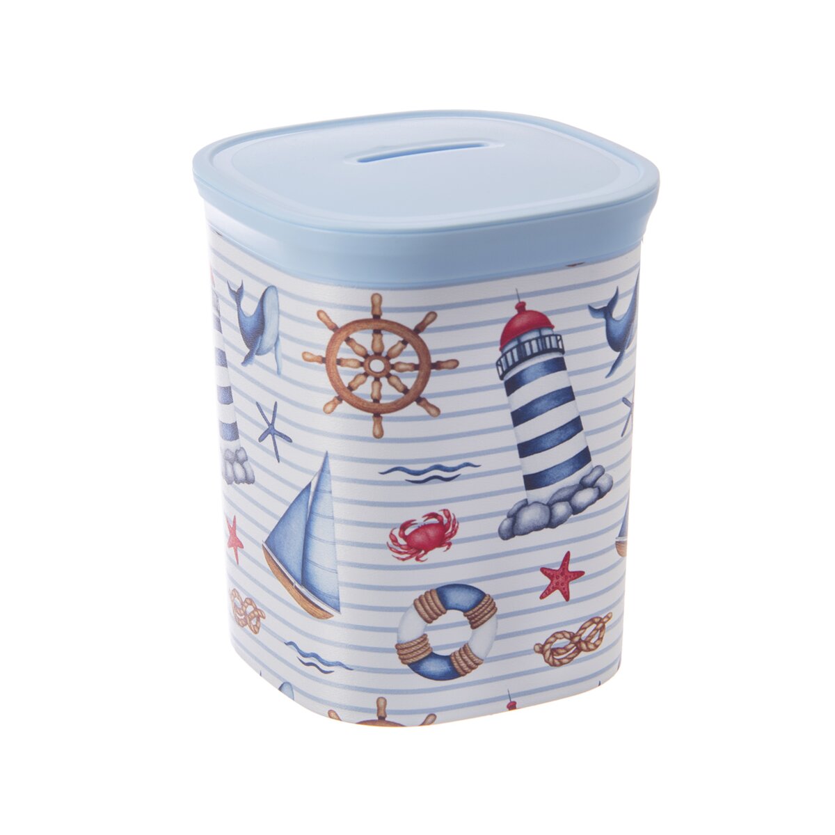 Na to dobre poslúži pekná pokladnička z plastu PP, ktorú zdobí jemný námornícky dekor. Má odnímateľné viečko, takže si ich malý alebo veľký šetrič môže čas od času prepočítať, či už tam je požadovaný obnos.
