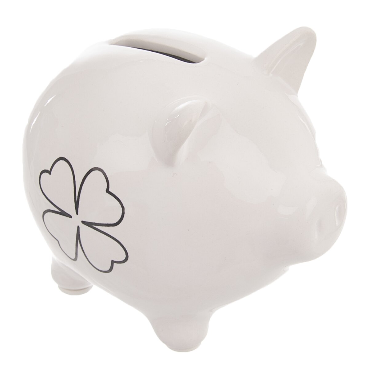 Kód produktu 821657Biela keramická pokladnička v tvare prasiatka s dekorom ŠTVORLÍSTOK. Jeho rozmery sú 9×7×7,5 cm.