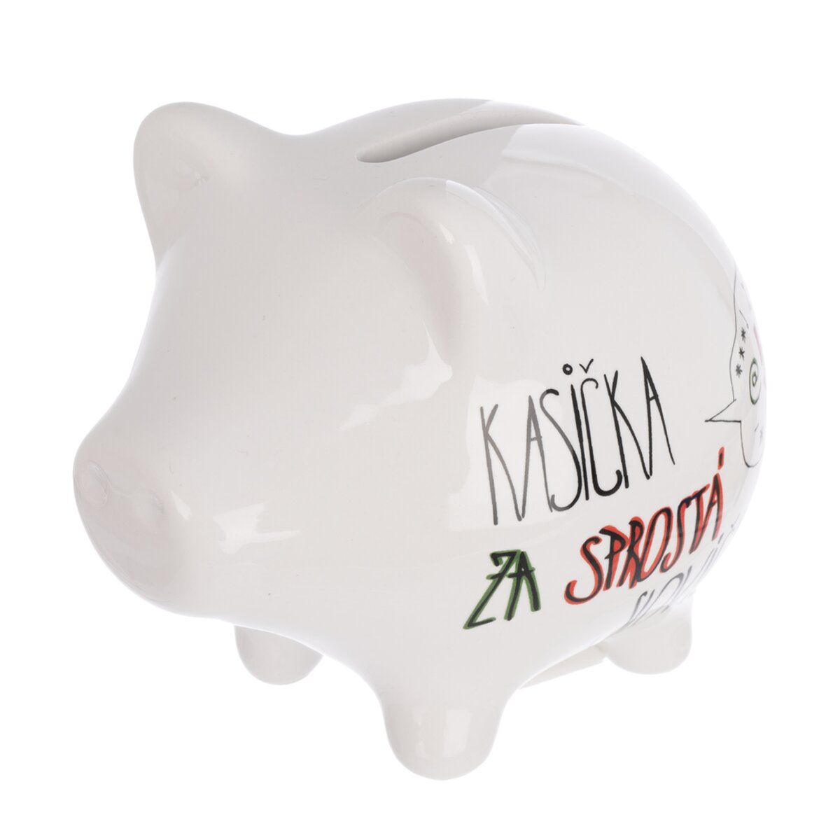 Kód produktu X14584Biela keramická pokladnička v tvare prasiatka s nápisom „Kasička za sprosté slovíčka“ prináša do domácnosti aj kancelárie zábavu a motivuje k lepšiemu slovníku. Každé peprné slovíčko znamená príspevok do pokladničky, čo z nej robí ideálny doplnok pre domáce pobavenie, firemné prostredie alebo ako originálny darček pre kamaráta s prerezaným jazykom. Vďaka svojmu hravému a štýlovému dizajnu pobaví a rozosmeje každého. Zospodu je opatrená praktickou zátkou pre ľahké vybratie úspor. Materiál: keramika. Rozmery: 20,5x15,5x16 cm. Designed by Orion.