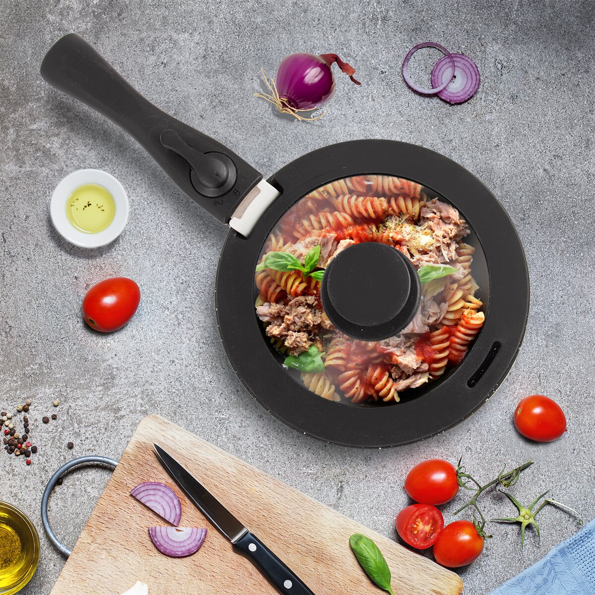 Kód produktu 126334Sklenená pokrievka so silikónovým lemom a úchytom v celkovom priemere 19 cm je doplnená otvorom na únik pary a výrezom na odnímateľnú rukoväť.