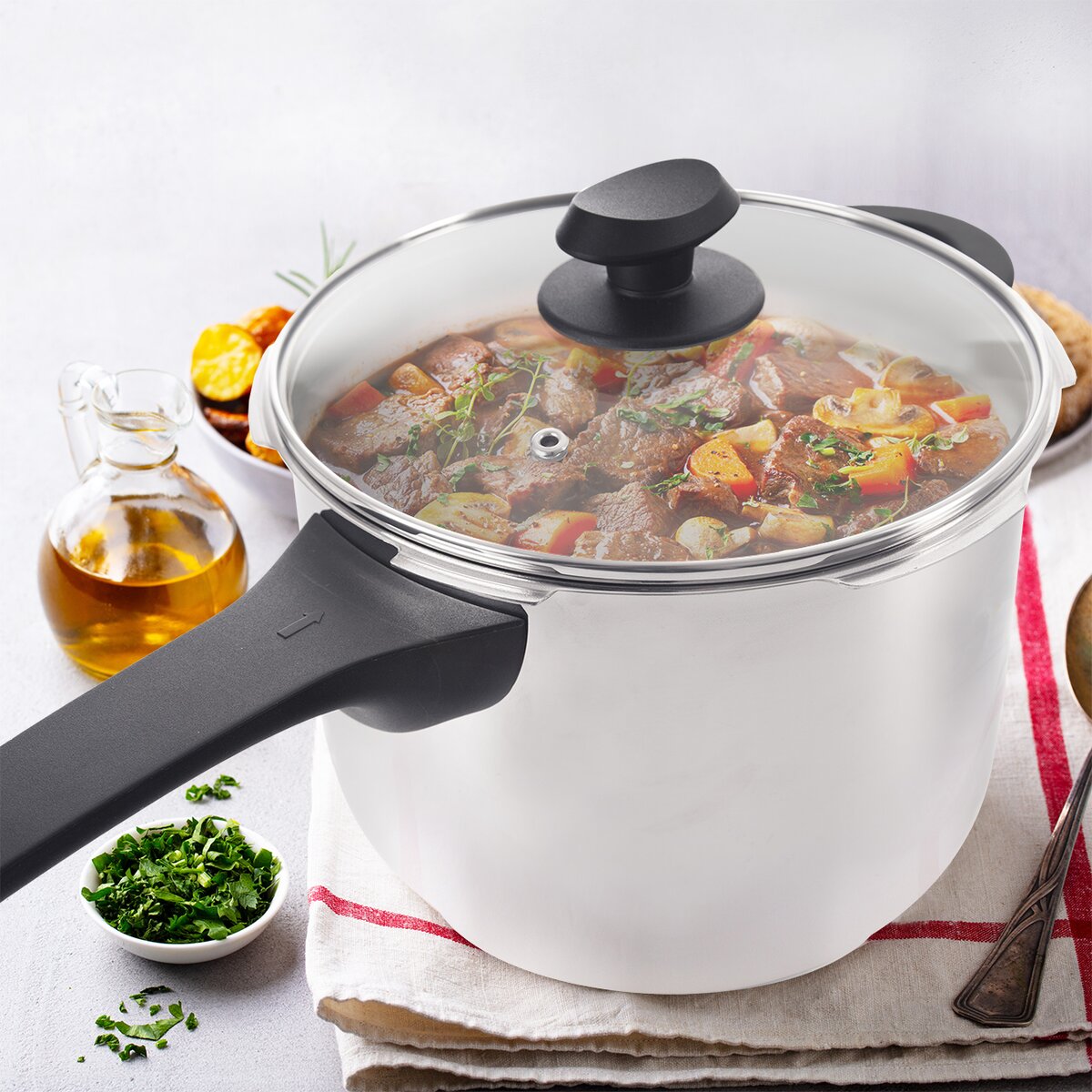 Pokiaľ nie je veľa času a obed sa blíži, hocikto rád siahne po tlakovom hrnci. Zvlášť v prípade prípravy vývaru z kostí alebo hovädzieho na guláš. A po zmäknutí pod tlakom je potrebné pokrm dovariť. K tomu je možné použiť samostatnú sklenenú pokrievku s nerezovým lemom a pevným plastovým úchytom. Tá ušetrí energiu aj čas pri varení, po zahustení omáčky, preváraní polievkových rezancov a pod. Je opatrená otvorom pre únik prebytočnej pary.