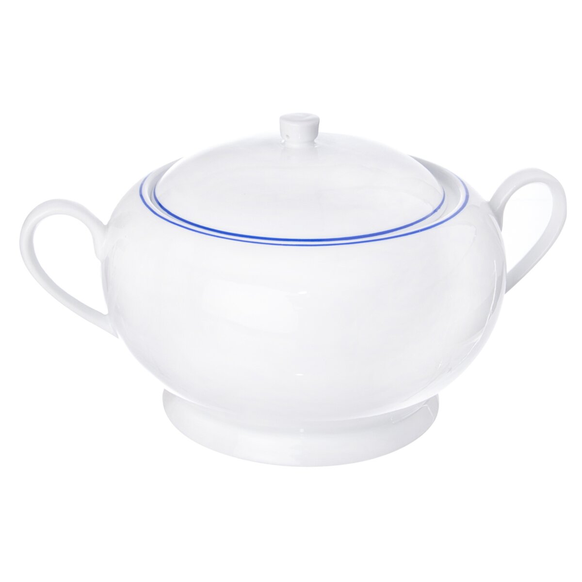 Kód produktu 128357Misa polievková so zdobeným okrajom - modrá linka. Materiál: porcelán. Rozmery: objem 2,6 l, pr. 21 cm, v. 15 cm.