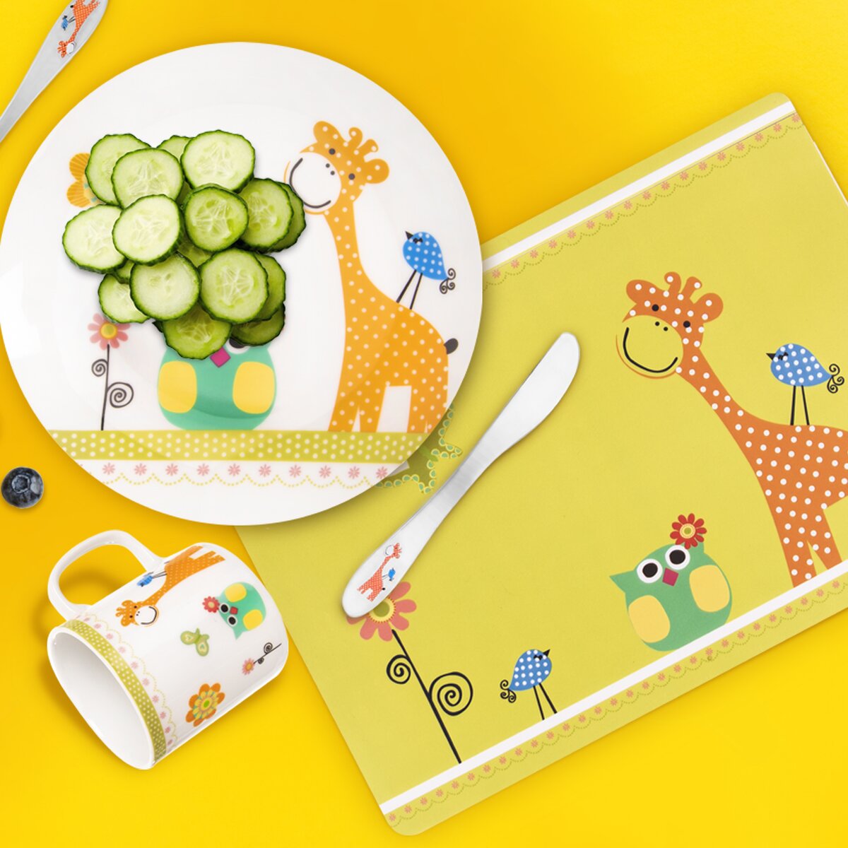 Veselé prestieranie obdĺžnikového tvaru so zaoblenými rohmi s detským mottom žirafy pre stolovanie malých stravníkov.