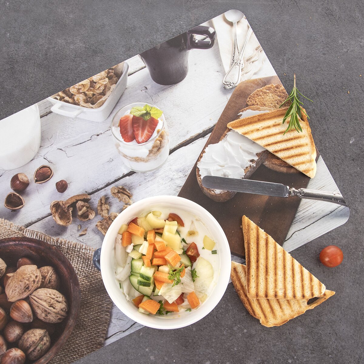 Tam, kde je interiér veľmi jednoduchý, toto výrazné prestieranie plné ovocia, čerstvého chleba, kávy a pod. dobre vynikne. Môže byť aj samostatnou podložkou pod dochucovacou súpravou na jedálenskom stole alebo pod chlebovkou či kanvicou na kuchynskej linke.