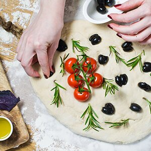 Na povrchu cesta vytvorte jamky a nalejte do nich olivový olej. Dosoľte, dozdobte, vložte do vyhriatej rúry a pečte dozlatista cca 15-20 minút na cca 200 °C. Podávajte s bylinkovým maslom a cesnakom.