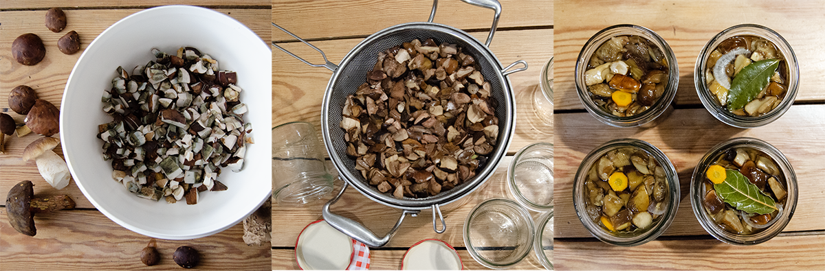 Nakrájané huby ľahko sparte v horúcej vode a sceďte. Nakrájajte si zeleninu na rezančeky, papriku a mrkvu pre farbu, môžete ale použiť i karfiol, cuketu, podľa toho, čo máte zrovna na záhradke. Nálev povarte s korením, čalamádu plňte do čistých pohárov a zalejte horúcim nálevom. Čalamádu zavarte 30 minút pri 85 °C.