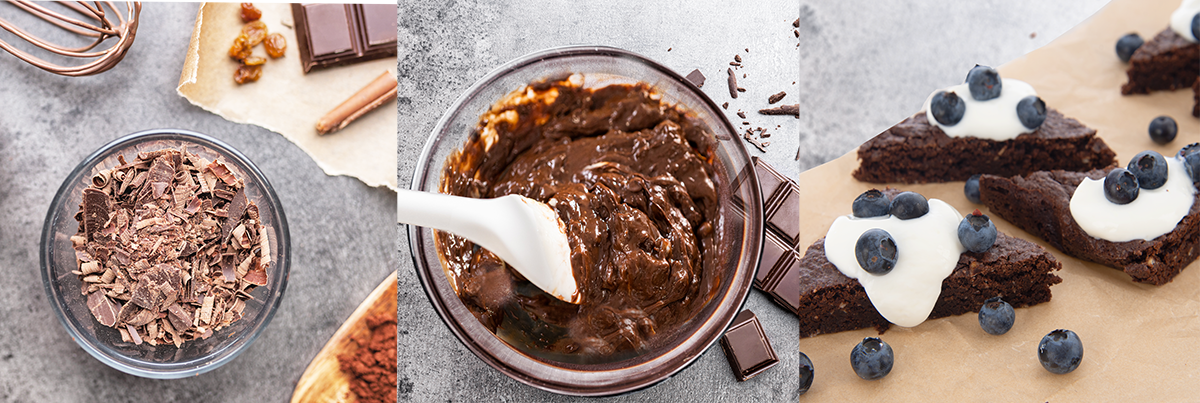 Cesto nalejte do vymastenej zapekacej misy, na toto množstvo sa hodí menší plech alebo zapekacia misa cca 30x20 cm a vložte do predhriatej rúry. Je možné tiež použiť papier na pečenie a formu ním vyložiť. Pečte pri 180 °C 20 minút. Po pichnutí špajlí by malo byť cesto ešte trochu lepkavé, to je ten správny okamih na vybratie vláčneho brownies z rúry. Nechajte ho vychladnúť v pekáčiku a potom krájajte na dieliky a podávajte s kyslou smotanou, tvarohom a ovocím. Sladiť ho nemusíte, vďaka cukru a čokoláde v ceste je tento luxusný a rýchly dezert sladký dostatočne.