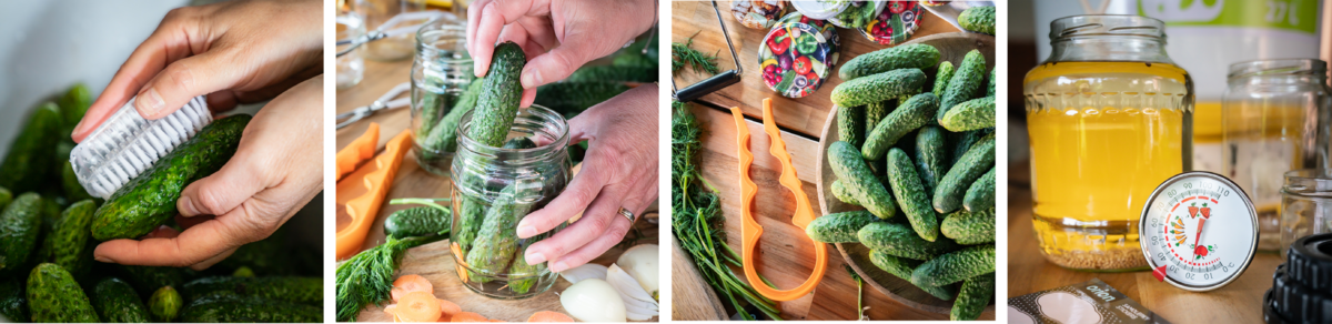 Čerstvé uhorky dôkladne umyte, s odstránením hliny pomôže aj praktická kefka so syntetickými štetinami. Nakrájajte si ostrým nožom cibuľu, olúpanú mrkvu a petržlen na kolieska, chren tiež.