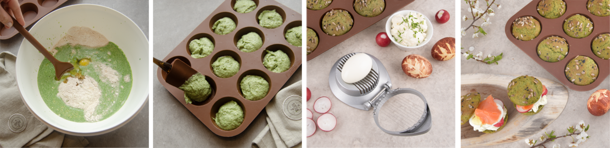 Predhrejeme si rúru na 180 °C. Cesto posypeme semienkami a vložíme do vyhriatej rúry. Pečieme 20 minút, prepečenie je možné skontrolovať špajľou. Po vybratí z rúry formu prikryjeme utierkou, potom jednotlivé žemle ľahko vyberieme, rozkrojíme, plníme vajíčkovou nátierkou, zdobíme lososom, reďkovkami, plátkami vajec nakrájanými v praktickom krájači, šalátom, kôprom alebo tým, čo máme radi.