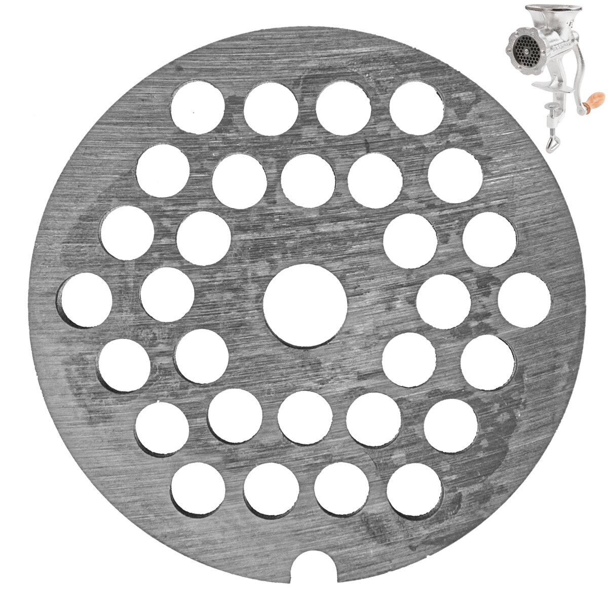 Kód produktu 180638Náhradná rezná doska do liatinového mlynčeka na mäso PORKERT veľ. 8. Priemer mlecích otvorov je 6 mm.