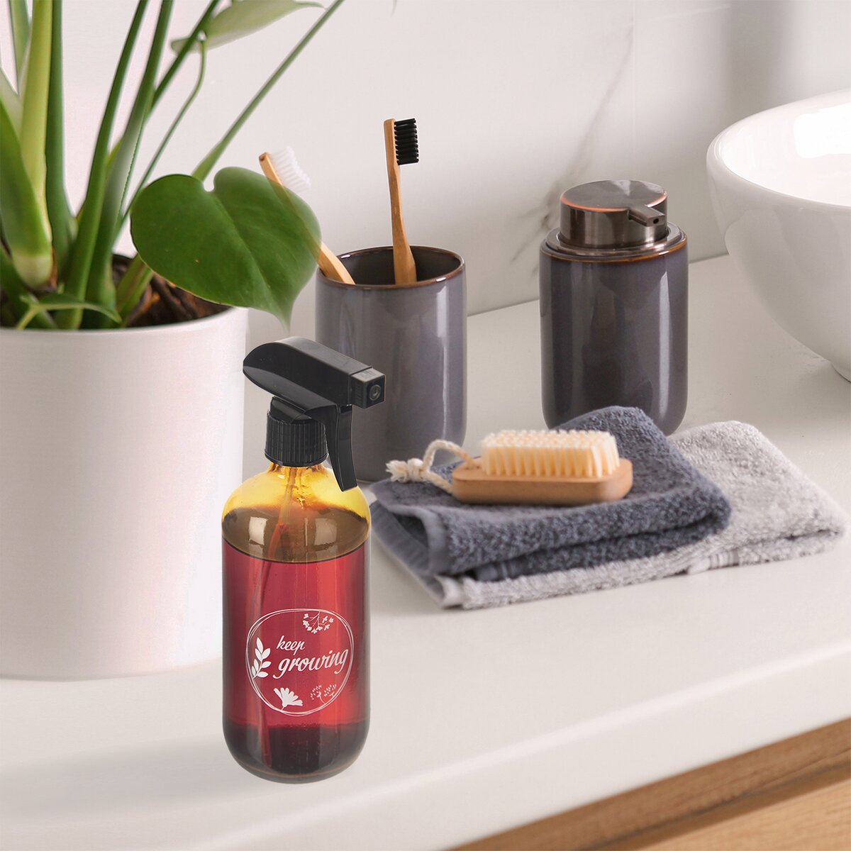 Rozprašovač má dymovo zafarbené sklo a plastovú čiernu hlavu na závit, kde stlačením páky rozprašujete vodu alebo roztok s výživou. Nádoba má priemer 7 cm. Rozprašovač je možné využiť aj pri upratovaní, čistení skiel, zrkadiel a iných lesklých plôch, ktoré čas od času potrebujete vyleštiť.