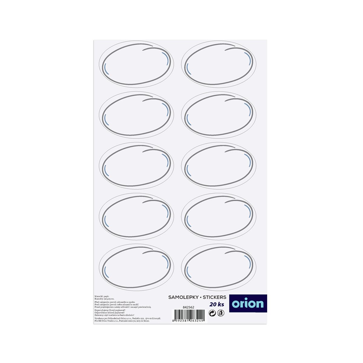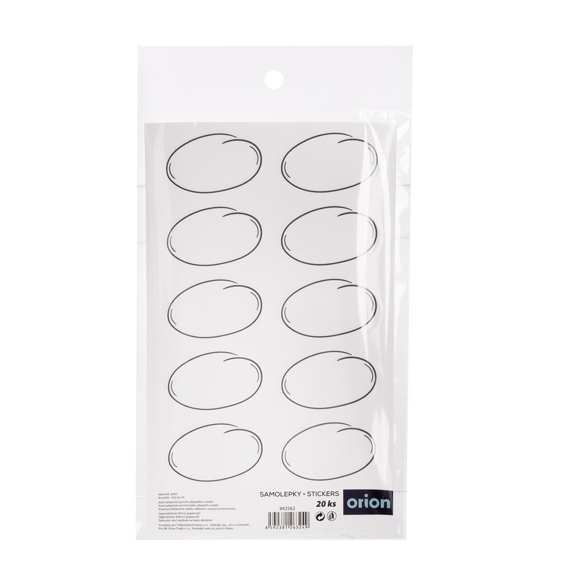 Kód produktu 842562Samolepiace štítky bez popisu na dózy s potravinami a koreničkami. Štítok je v oválnom tvare. Materiál: papier. Rozmery: 1 štítok 5x3,25 cm. Balenie obsahuje 20 kusov.