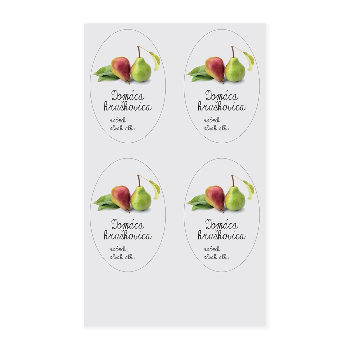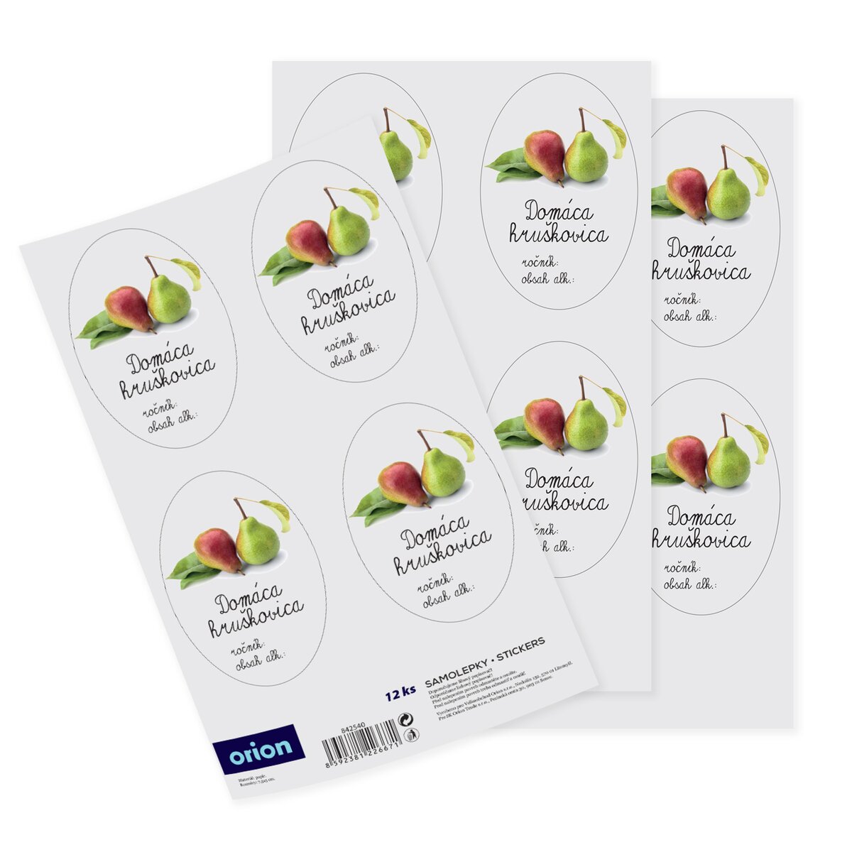 Kód produktu 842540Sada 12 kusov papierových samolepiek je doplnená obrázkom hrušiek a priestorom na označenie roku výroby hruškovice a obsahu alkoholu. Jedna oválna samolepka má rozmer 7,5x5 cm.