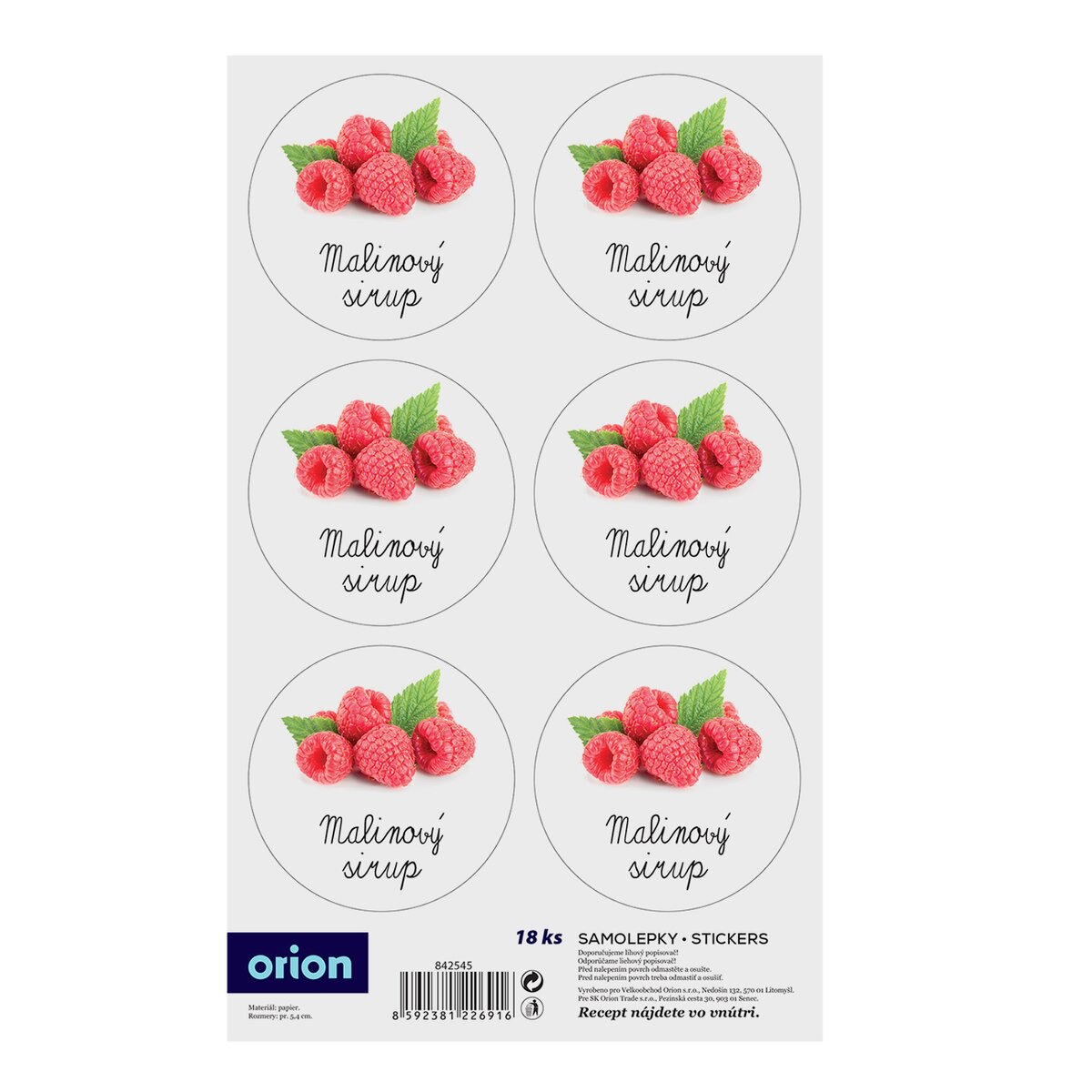 Kód produktu 842545Sada 18 kusov papierových samolepiek s obrázkom a popisom MALINOVÝ SIRUP. Priemer jednej guľatej samolepky je 5,4 cm.