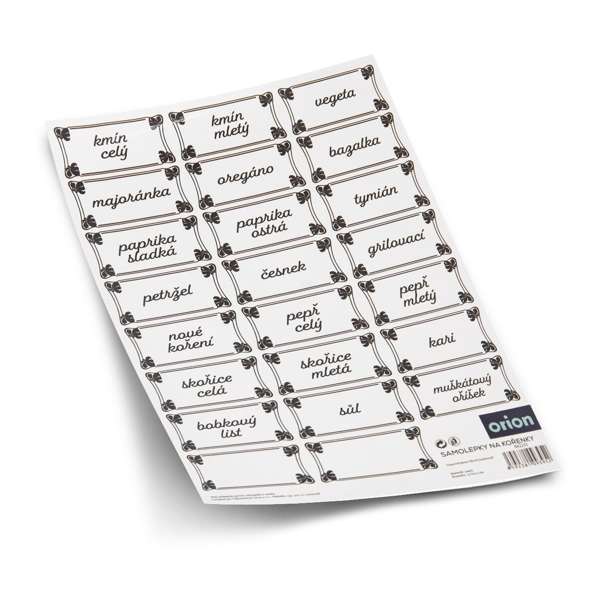 Arch obdĺžnikových samolepiek na koreničky a dózy s bylinkami v krásnom retro štýle. Obsahuje celkom 21 štítkov s popisom tých najpoužívanejších druhov korenia, ako je sladká paprika, mleté korenie, škorica, grilovacie korenie alebo bazalka. K tomu sú tam ešte dve prázdne nálepky, ktoré si môžete popísať podľa vašej potreby.