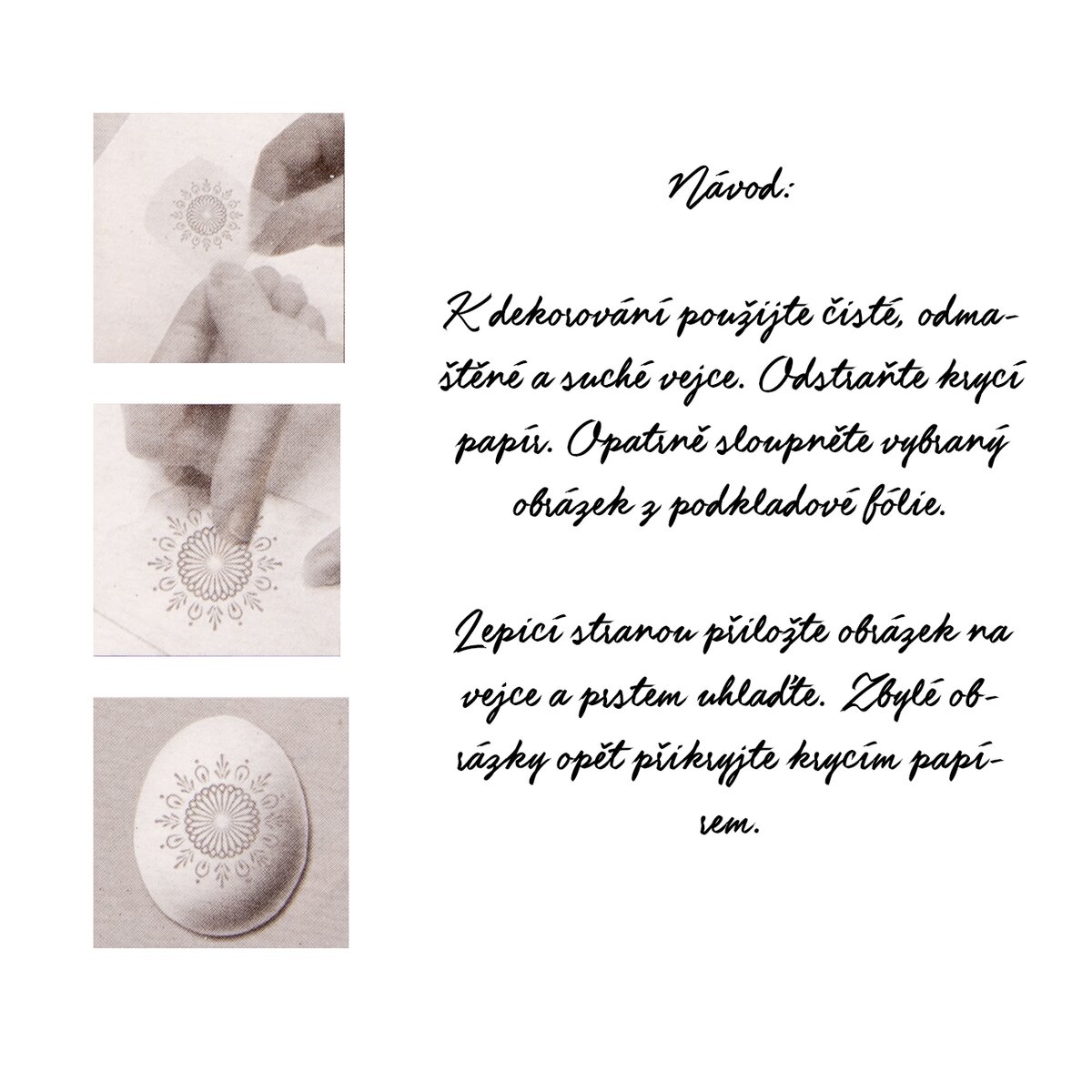 Výhodou je ich veľmi rýchla a jednoduchá aplikácia – na suché a odmastené vajíčko prilepíte vybranú samolepku zlúpnutú z podkladovej fólie. Podrobný návod je priložený vo fotogalérii.