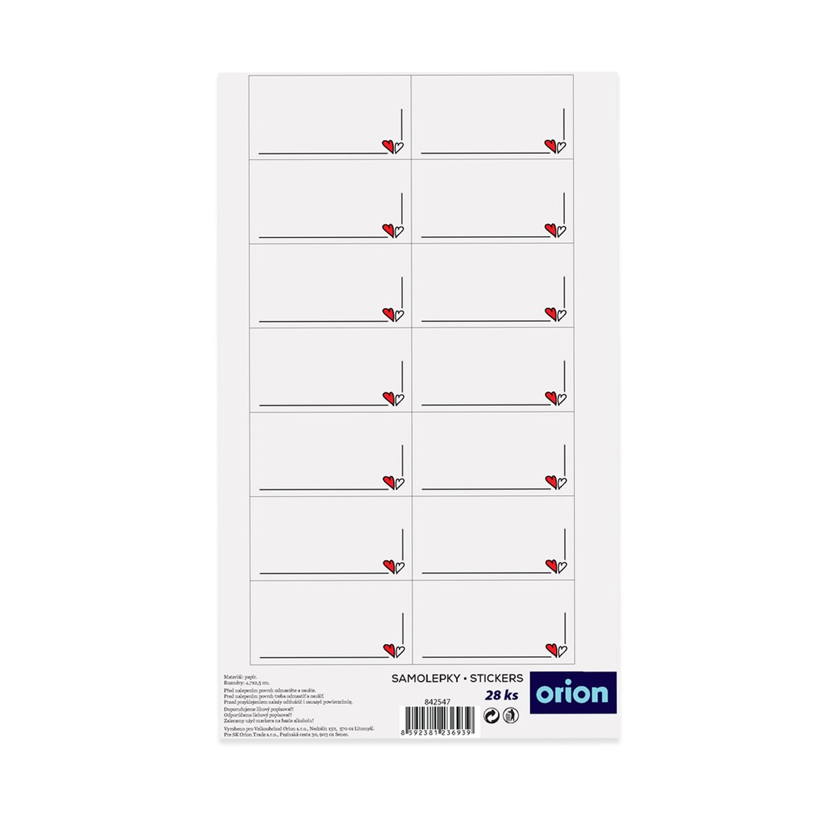 Kód produktu 842547Sada 28 papierových samolepiek SRDIEČKA s lamináciou, určených na vlastné popísanie. Každá nálepka má rozmer 4,3 x 2,5 cm.