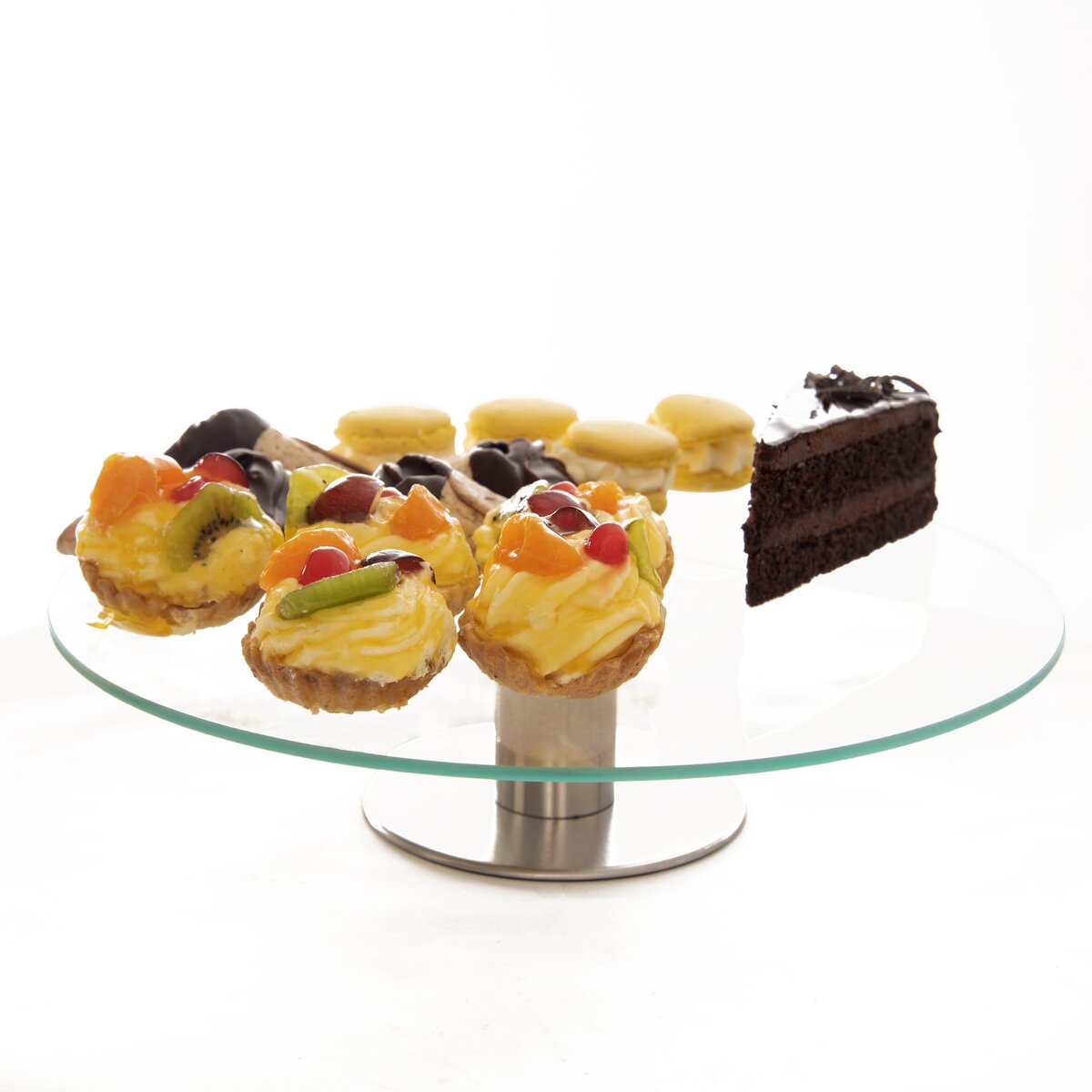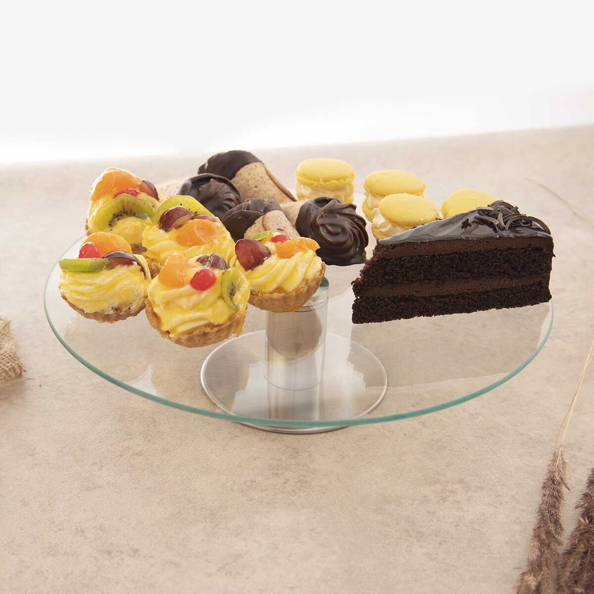 Kód produktu 122978Otočný sklenený stojan s priemerom 30 cm s nerezovým podstavcom pomôže štýlovo servírovať pizzu, zákusky aj chlebíčky, pomôže s ťahaním tort a ich zdobením.