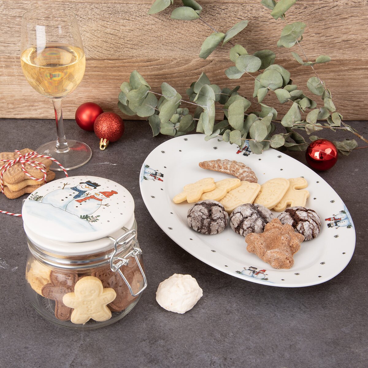 Kód produktu 129530Oválny servírovací tanier z porcelánu je zdobený originálnym motívom dvojice snehuliaka, možno ho umývať v umývačke riadu a používať v mikrovlnnej rúre.