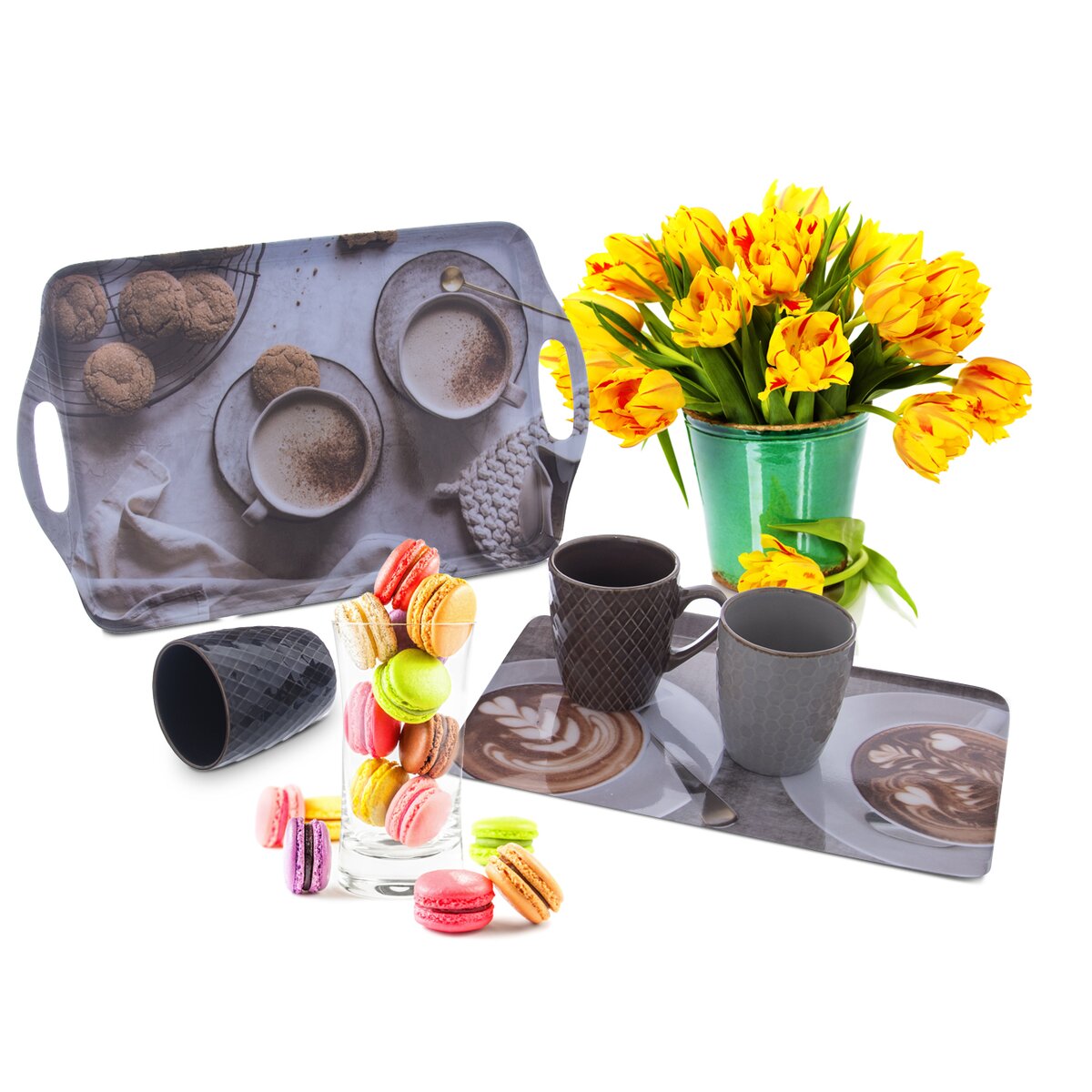 Štýlová tácka z melamínu rozžiari každý interiér. Je ozdobená originálnym dekorom s motívmi kávy a cappuccina. Je ako stvorená na servírovanie chlebíčkov a jednohubiek. Môžete na nej podávať aj rôzne dezerty a slané pochutiny alebo preniesť kávu a iné nápoje do obývacej izby či na terasu za vašimi priateľmi alebo hosťami.