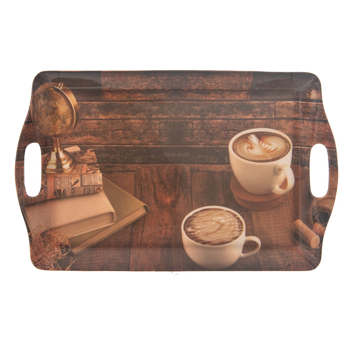 Kód produktu 153865Melamínová obdĺžniková tácka s rozmermi 37x22,7x2,5 cm s uchami a farebným dekorom s motívmi kávy.