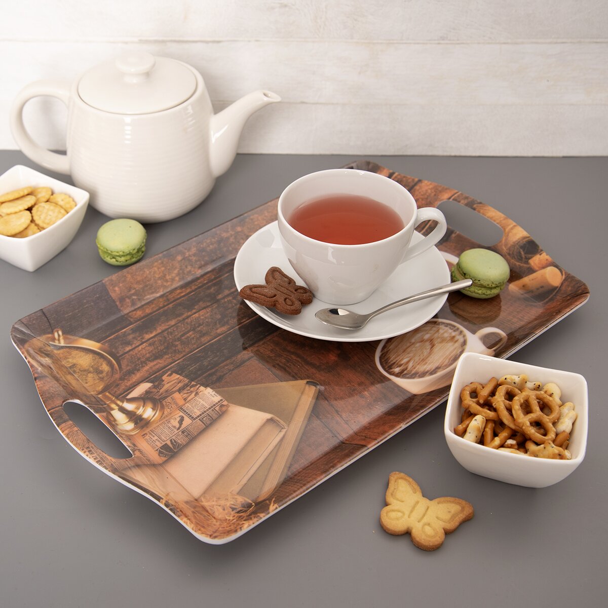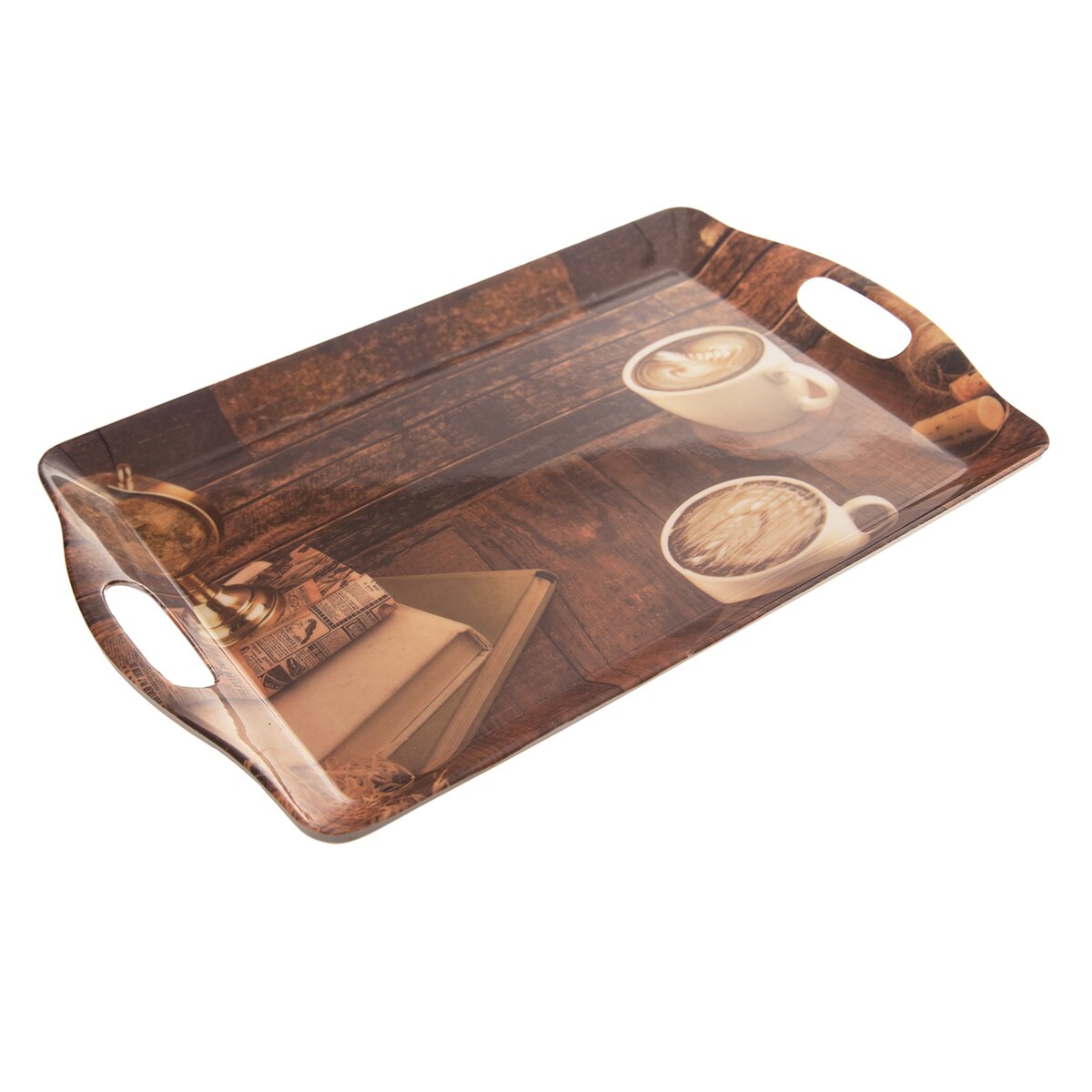 Väčšia štýlová tácka z melamínu rozžiari každý interiér. Na ploche sa objavuje motív kníh a hrnčekov s kávou.
