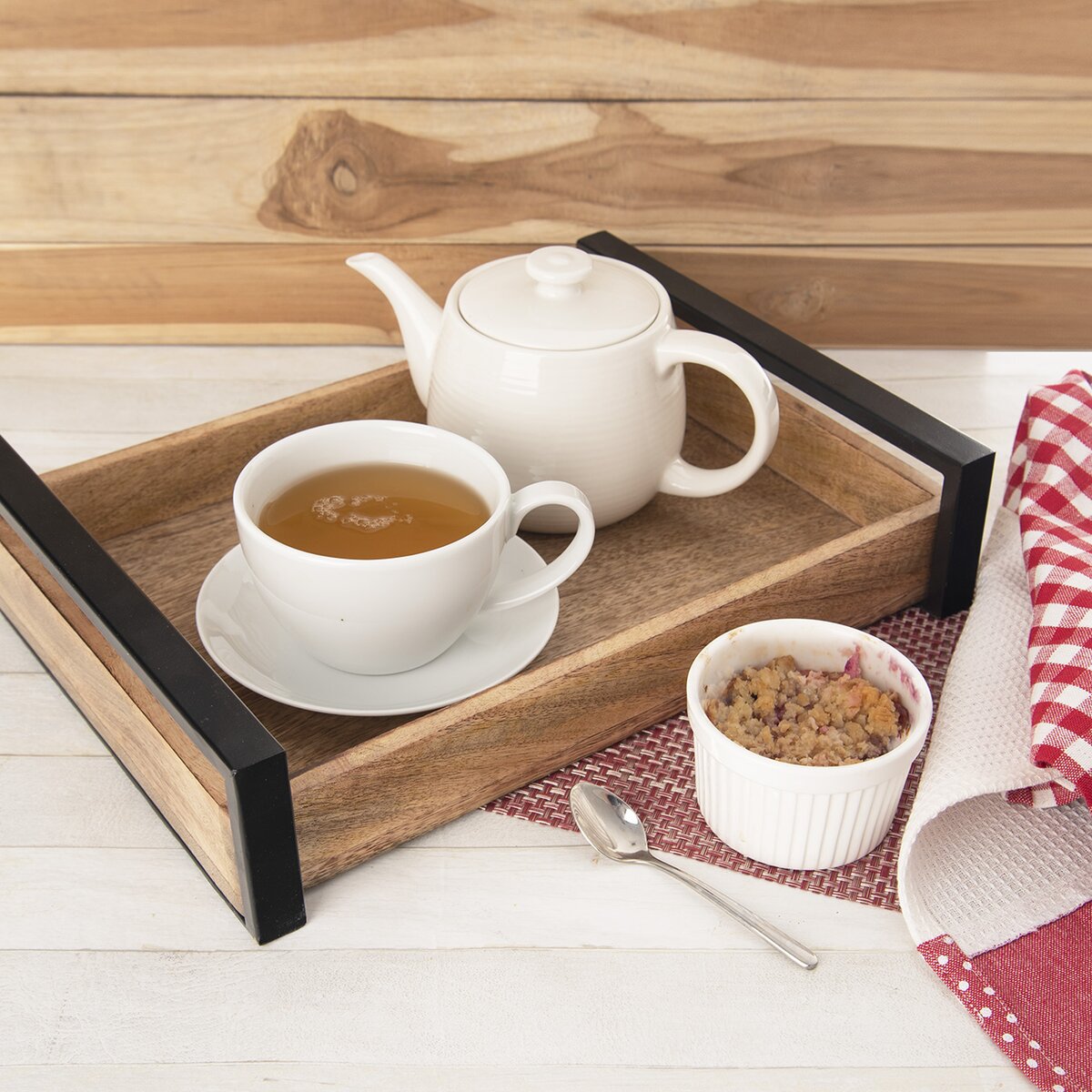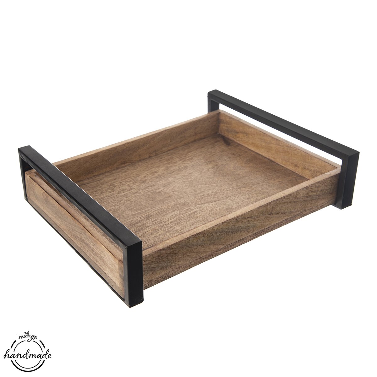Dobrú kávičku, čaj, domáci koláč alebo drobné zákusky ľahko prenesiete na servírovaciu tácku z mangového dreva. Bočné kovové časti s čiernym nástrekom z tohto menšieho podnosu robia dizajnovú záležitosť. Môže byť aj zaujímavou podložkou na kvetináče s bylinkami, miestom na uloženie dochucovadiel, vázy s kvetinami alebo misky s kamienkami a sviečkou.