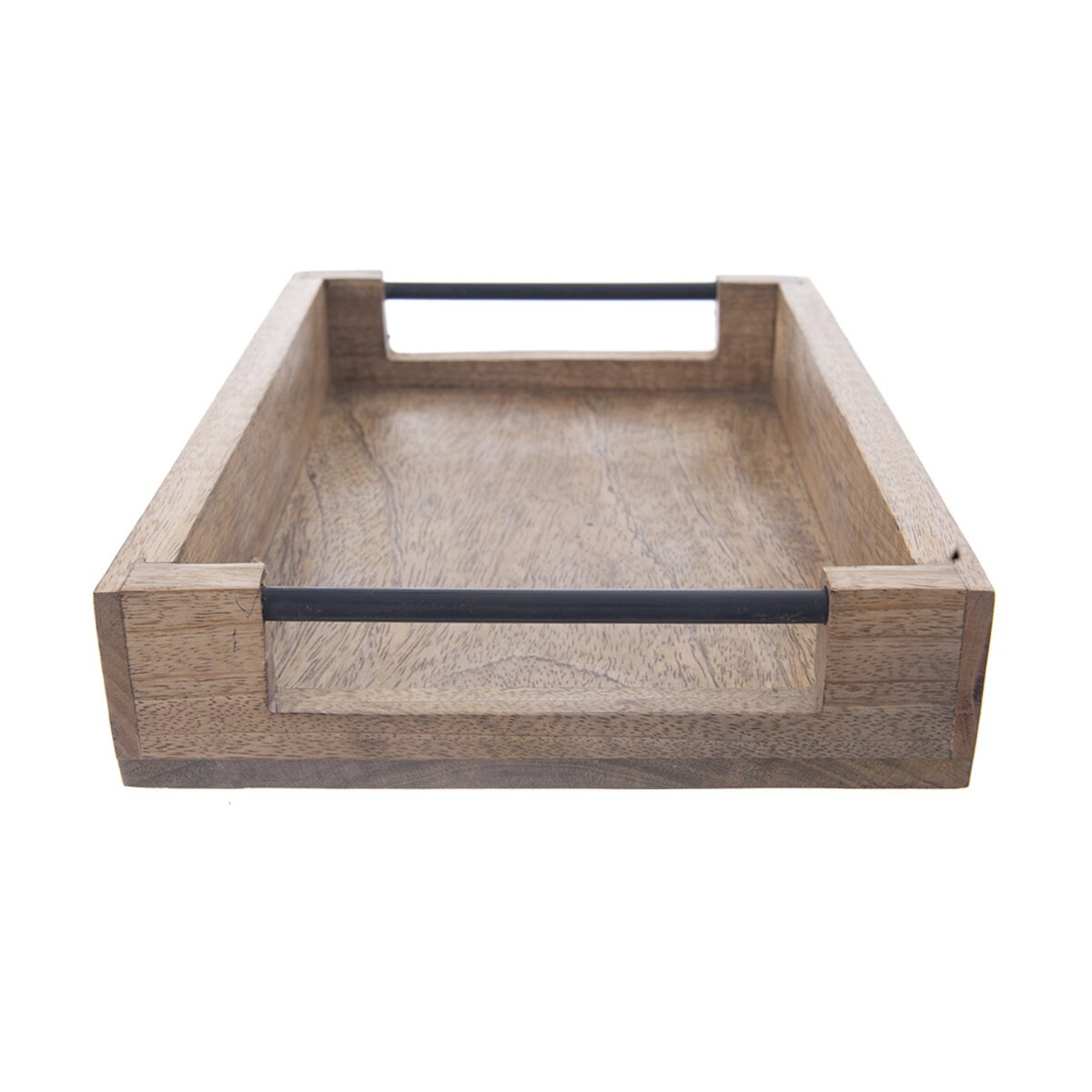 Kód produktu 153881Drevená tácka MANGO s čiernymi kovovými držadlami, vo veľkosti 40,5x30x5,7 cm, pomôže preniesť drobné občerstvenie aj kávu. Je ideálna na servírovanie, ale poslúži aj ako dizajnový kúsok.