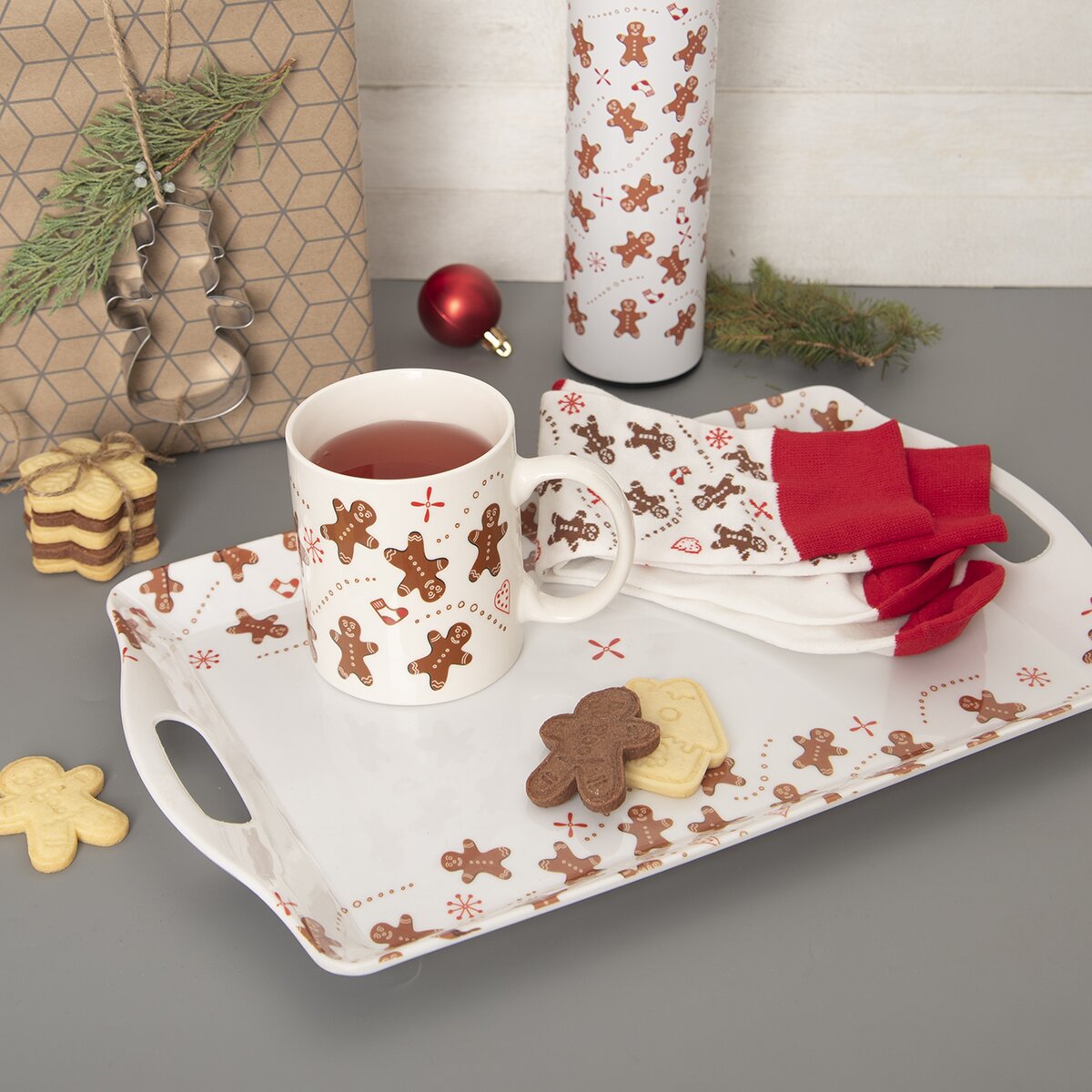 Pán Perníček, roztomilý nezbedník, sa objavil aj na melamínovej tácke. Táto väčšia tácka, doplnená uchami po stranách, je ideálna pre podávanie rôznych druhov vianočných cukroviniek, dezertov, múčnikov, chlebíčkov na tanierikoch i slaných pochutín v miskách. Pomôže aj s prenesením kávy a iných nápojov po nedeľnej sieste.