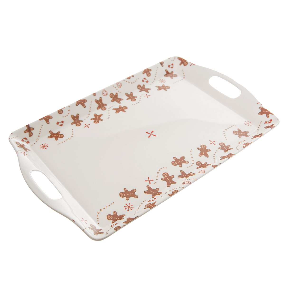 Kód produktu 153867Melamínová obdĺžniková tácka s rozmermi 37x22,7x2,5 cm s uchami a jemným dekorom s motívmi perníčkov.
