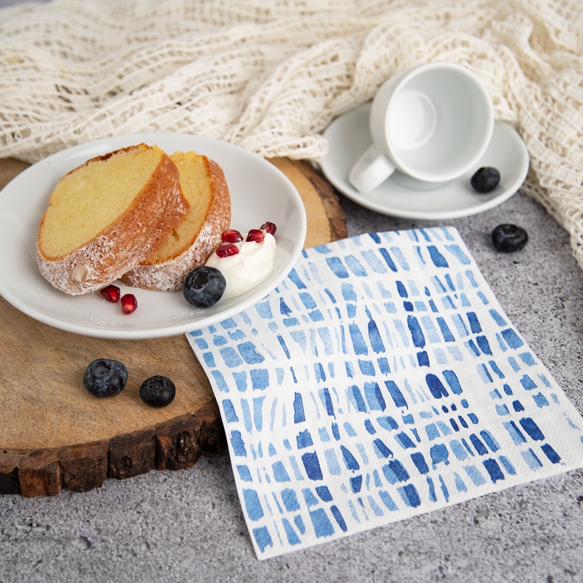 Tieto trojvrstvové papierové obrúsky majú štýlovú modrú potlač, čiastočne pripomínajúcu batiku.