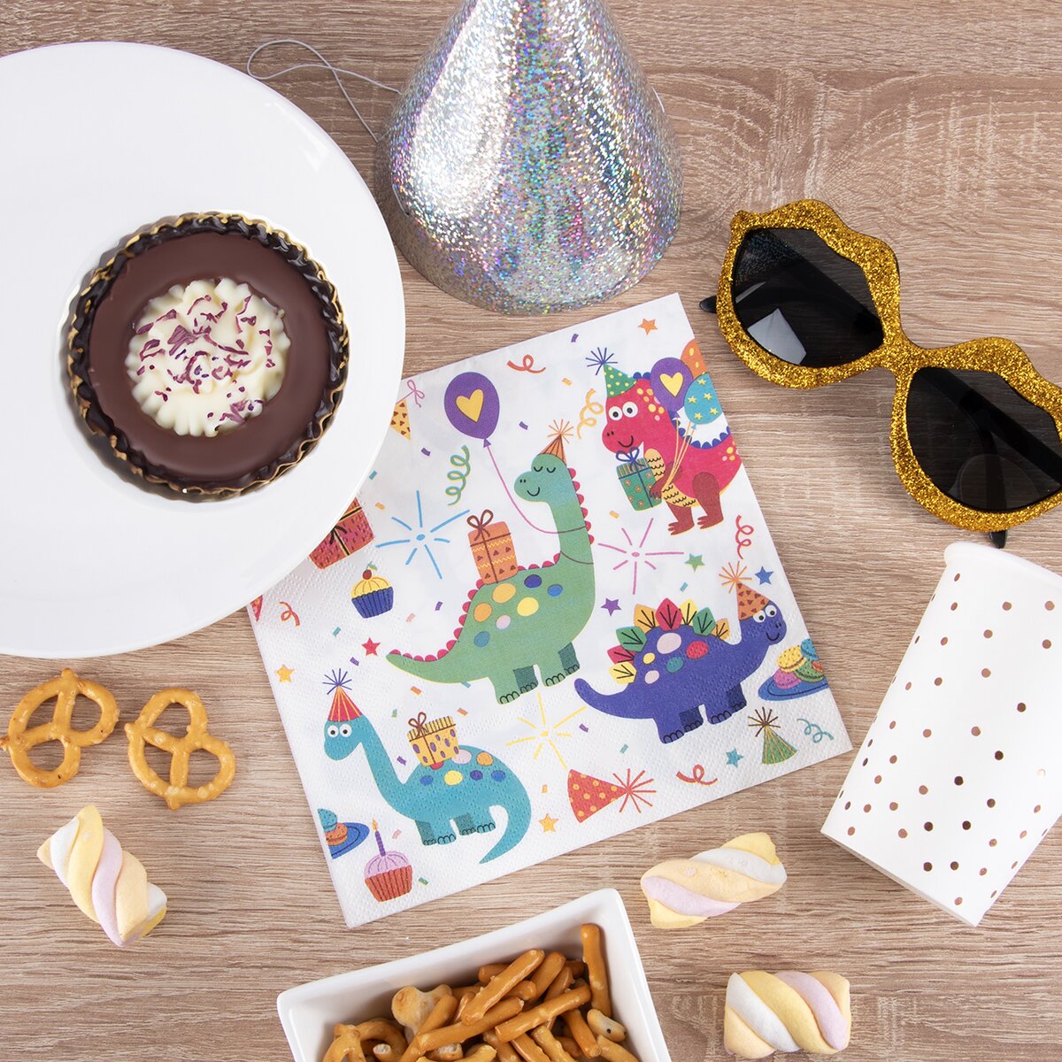 Hurá na párty plnú pekne naservírovaných dobrôt. Na detskej oslave sú na utretie úst a rúk potrebné obrúsky, ktoré k stolovaniu tiež patria. Tieto zdobia milý dekor dinosaurov, ktorý očarí chlapcov aj dievčatá.