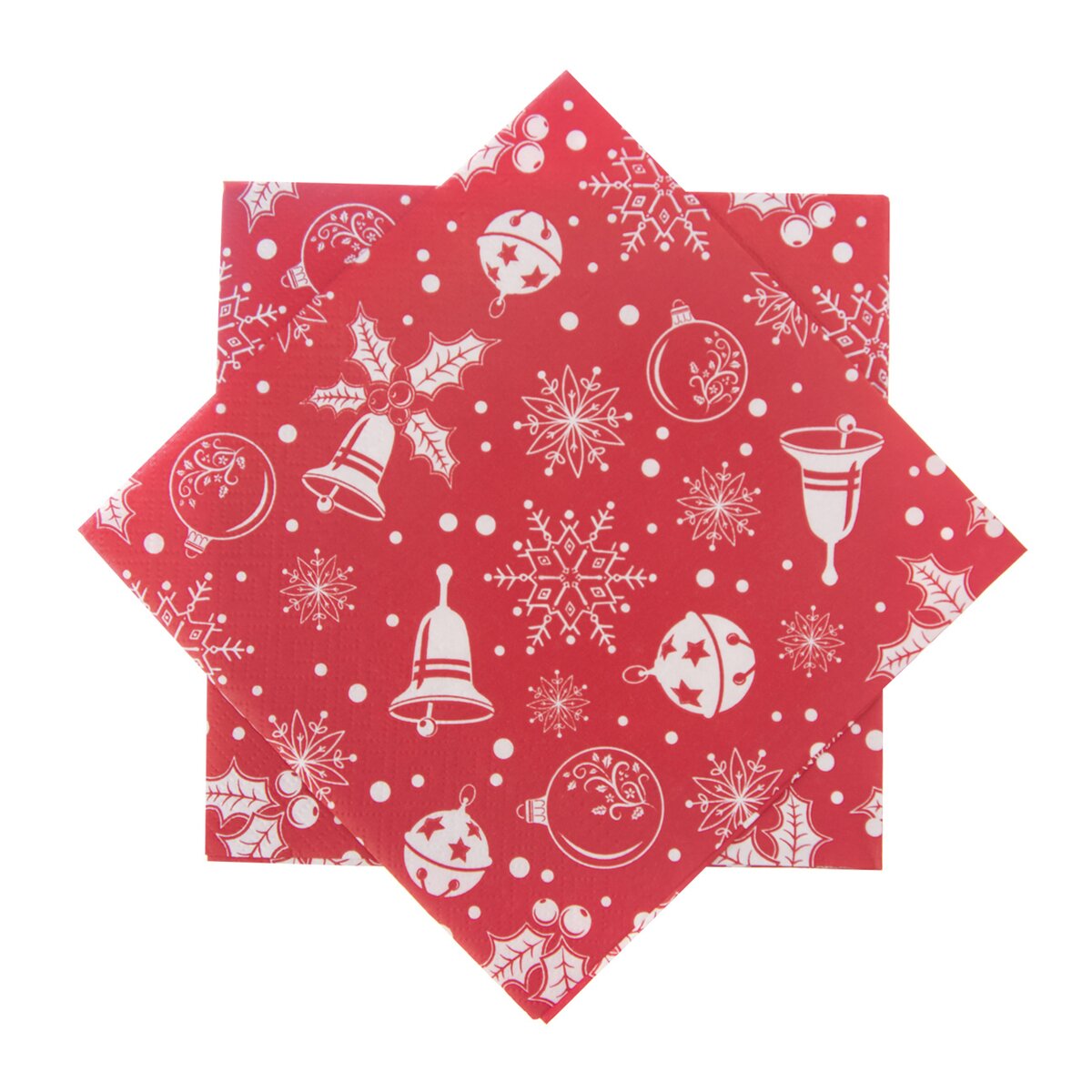 Kód produktu 842307Sada 20 ks červených papierových obrúskov s motívom vločiek a zvončekov, vo veľkosti 33x33 cm, doplní prestretý stôl počas vianočných sviatkov aj v období Adventu.