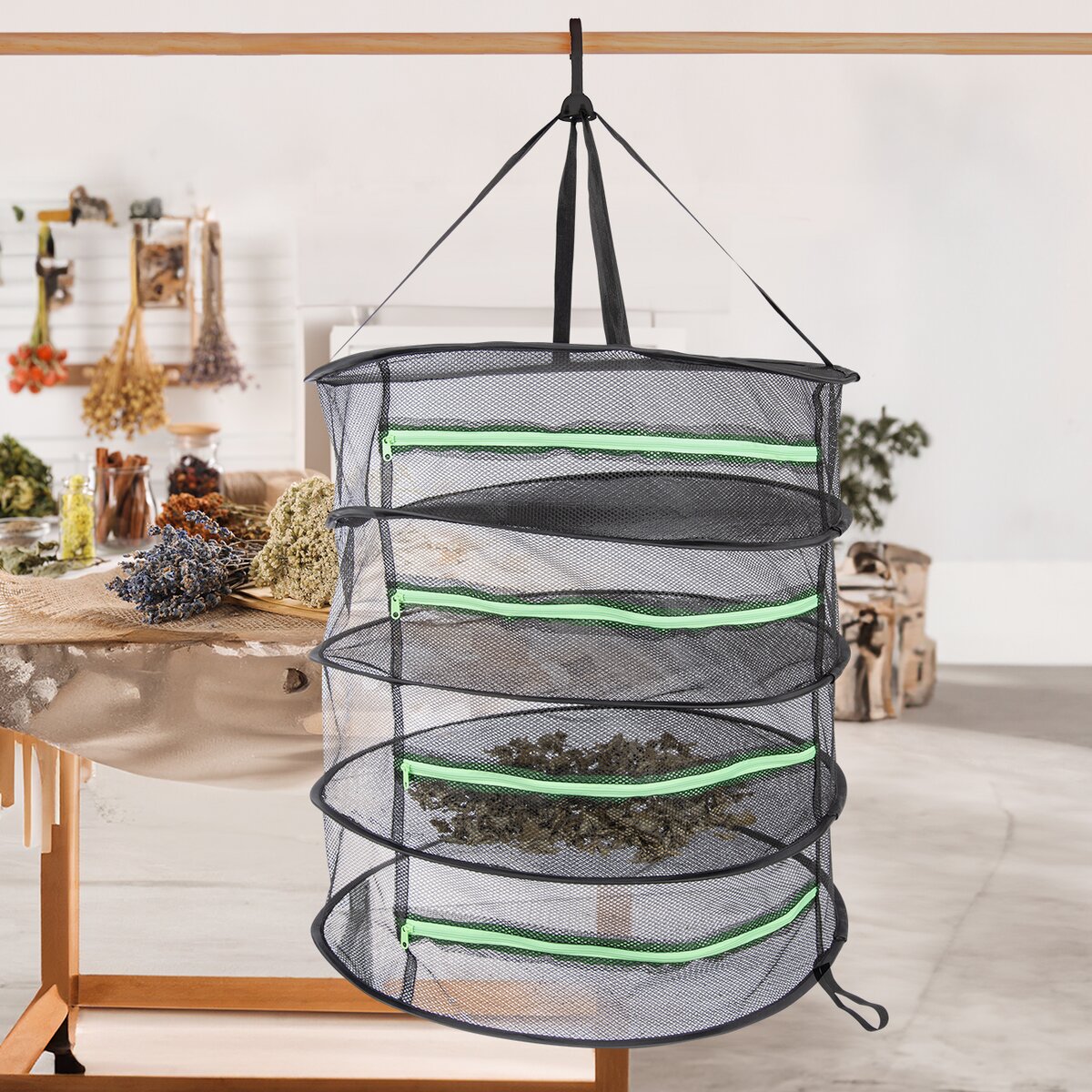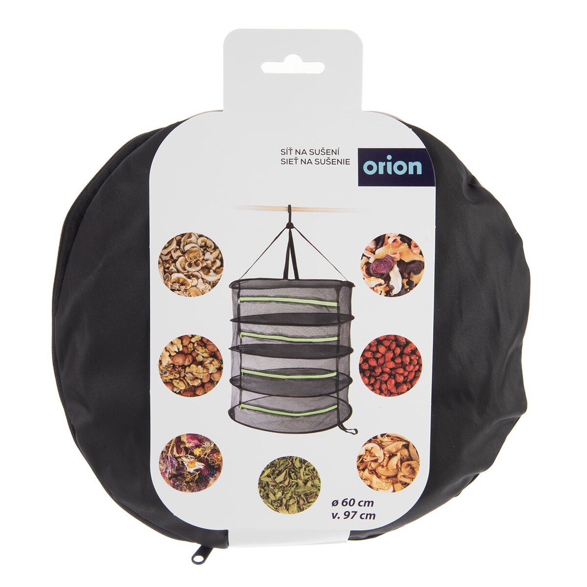 Kód produktu 780617Závesná 4poschodová sieť na sušenie byliniek, ovocia, zeleniny, húb a pod. má priemer 60 cm a je možné ju ľahko zložiť a rozložiť. Vybavená praktickým háčikom na zavesenie a zipsom na každom poschodí.