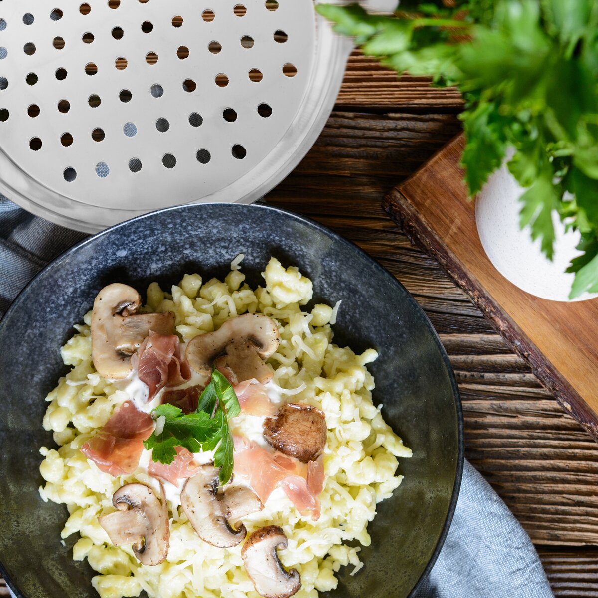 Kód produktu 124463Nerezové okrúhle sito a plastová stierka určená na výrobu halušiek, pečeňovej i drožďovej závarky do polievok.