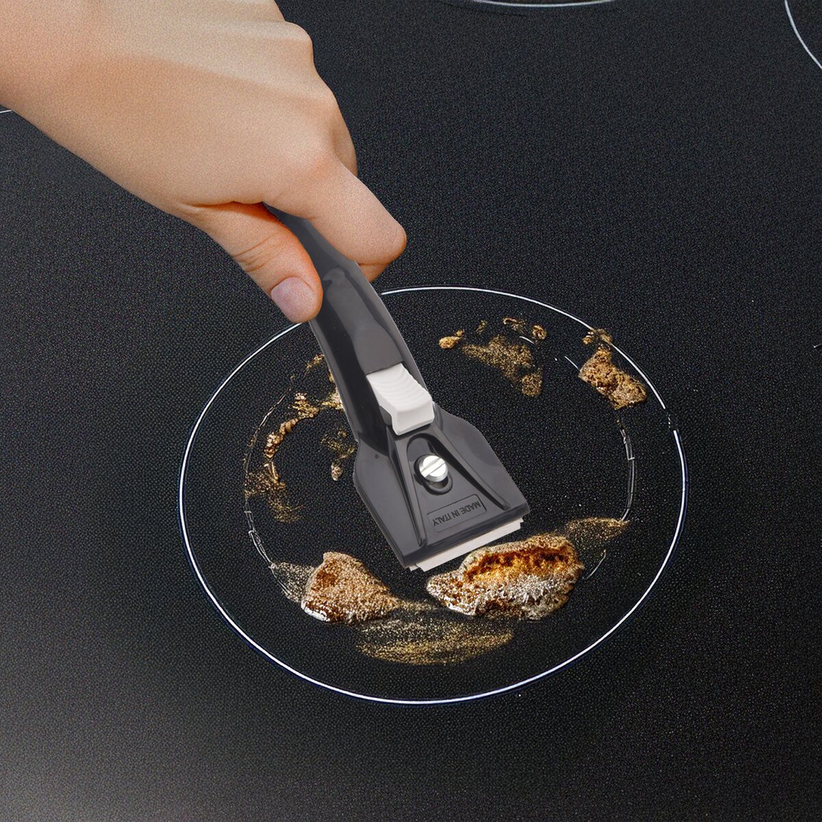 Škrabka Vám pomôže odstrániť napečené a zaschnuté nečistoty zo sklokeramickej dosky, zvyšky samolepiek zo sklenených povrchov a pod.