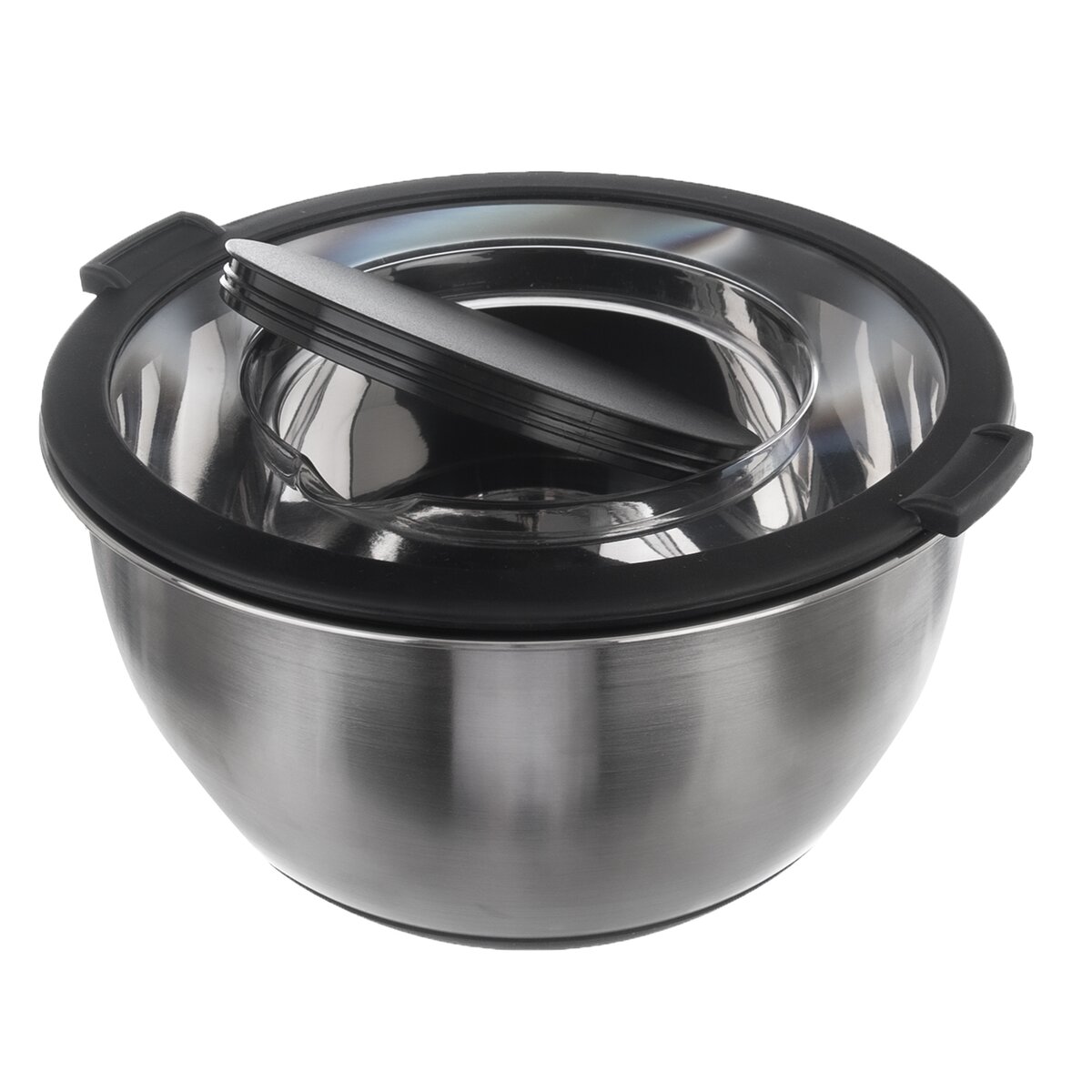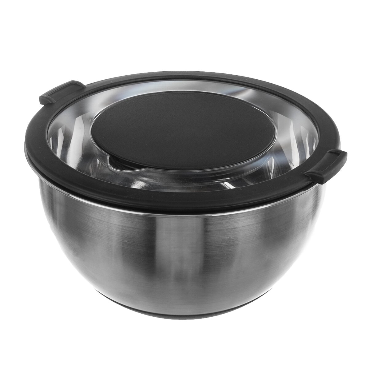 Kód produktu 120293Kvalitná okrúhla nerezová misa objemom 3 l, s priehľadným plastovým viečkom a s otváracím stredom, ktorý uľahčí šľahanie, zabráni striekaniu cesta. Má praktické protišmykové silikónové dno.