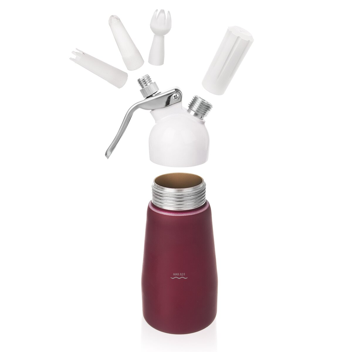 Praktickým pomocníkom, ako si počas chvíle pripraviť kvalitnú šľahačku zo smotany na šľahanie, je odolná hliníková nádoba so silikónovým tesnením, so skrutkovacou hlavou, tryskou a tromi nástavcami a čistiacou kefkou. Vďaka nim je možné vytvoriť nadýchanú šľahačkovú ozdobu na vašich tortách, dezertoch, palacinkách, vafliach, zmrzlinových a ovocných pohároch, ale zjemníte aj omáčky a polievky alebo vytvoríte sladké a slané peny.