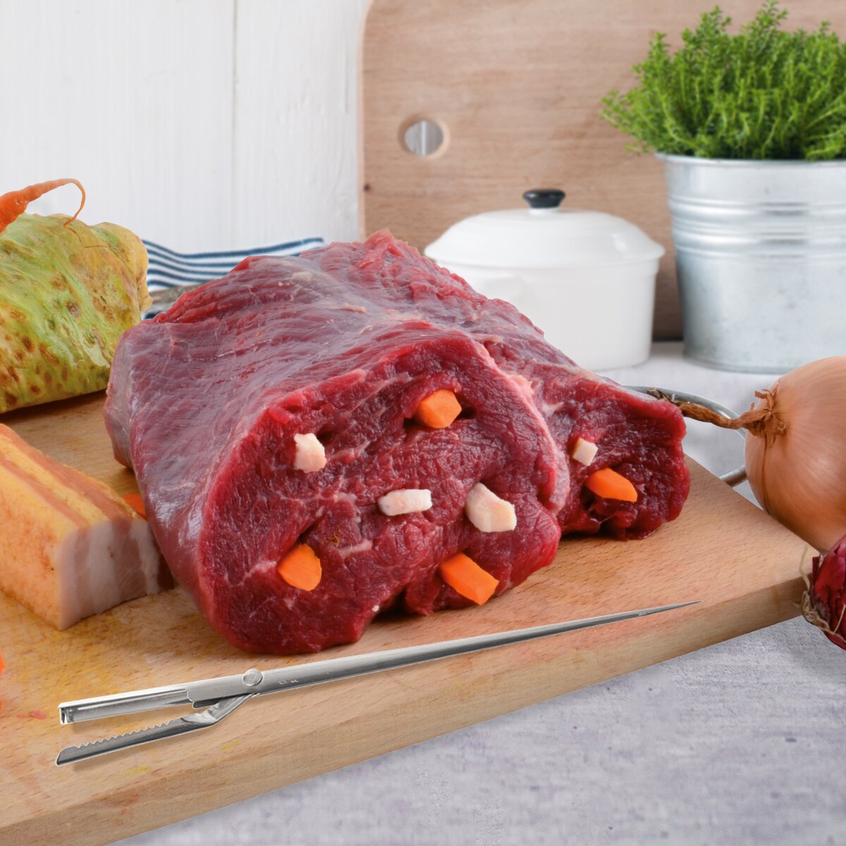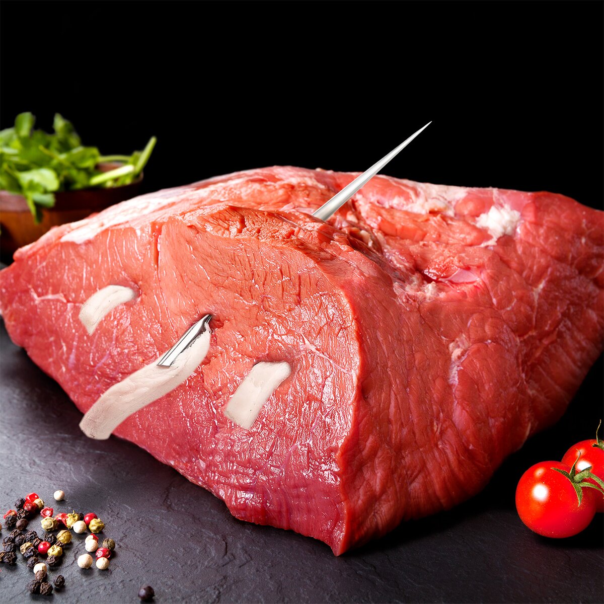 Viac informáciíNerezová ihla na špikovanie je vynikajúci pomocník, ktorý uľahčí prácu s prípravou mäsa na pečenie. Často sa používa tenký špikovací nôž a slanina sa necháva ľahko zmraziť, aby preťal mäso do hĺbky. Vďaka ihle ale "pretiahnete" slaninu cez mäso jedným ťahom. Najčastejším druhom mäsa vhodným na prešpikovanie je hovädzie zadné na tradičnú sviečkovú, zverina, králik na pečenie, bravčové stehno alebo jahňacie. Získa šťavnatosť a prúžok slaniny pri krájaní vytvorí drobnú mozaiku.