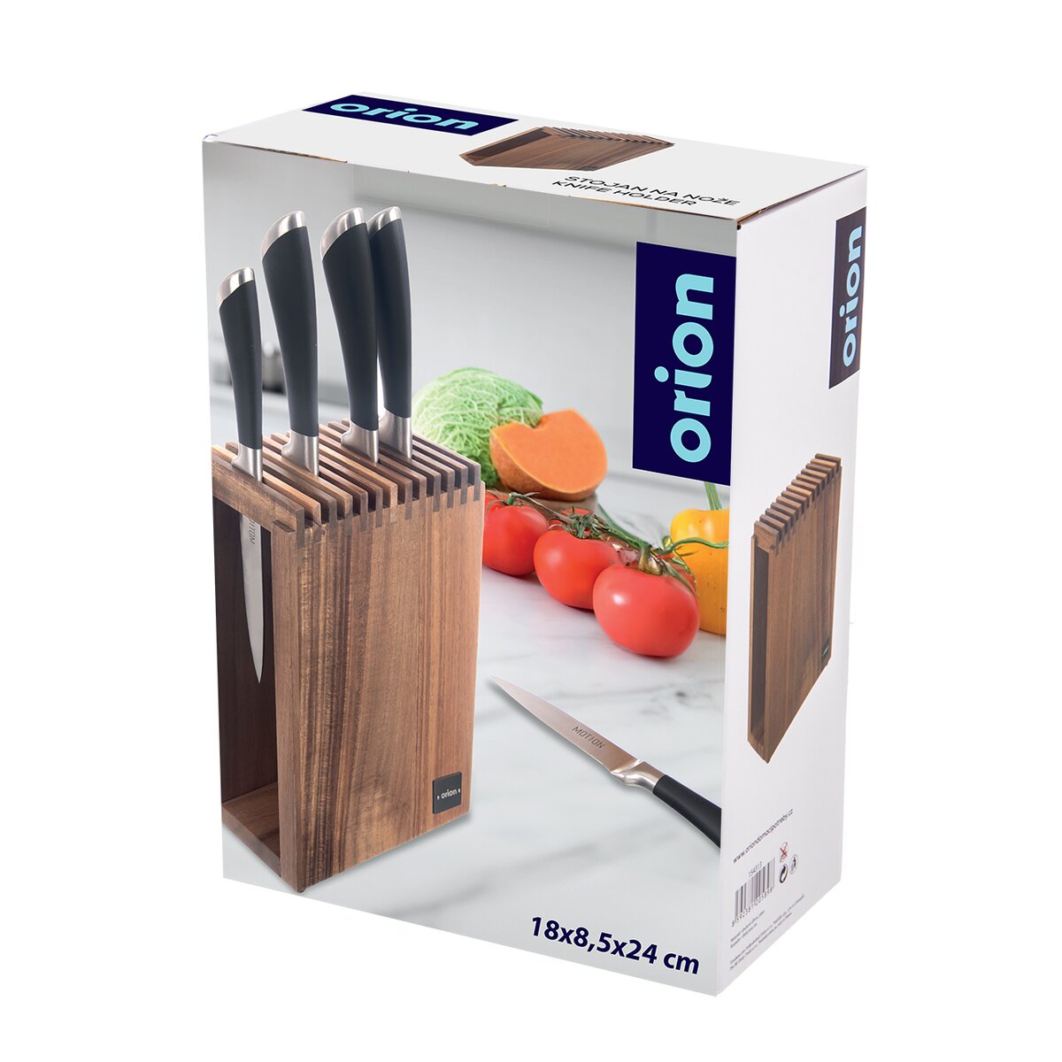 Praktickým riešením na uloženie ostrých kuchynských nožov je stojan na nože. V tomto stabilnom stojane z orechového dreva je možné uložiť nože, či už ide o malé nože na zeleninu alebo veľké santoku nože so širším ostrím. Každý nôž stačí vsunúť do drážky v hornej časti, takže sa nebudú o seba trieť, nedôjde k tupeniu a poškodeniu ostrie.